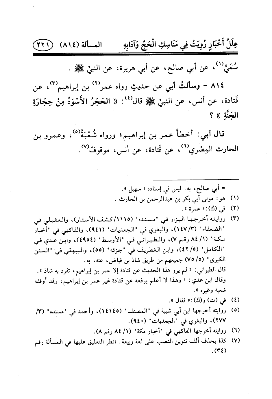 ٨١٤ - وسألتُ أَبِي عَنْ حديثٍ رَوَاهُ عُمَرُ (٢) بْنُ إِبْرَاهِيمَ (٣) ، عَنْ قَتادة، عن أنس، عن النبيِّ (ص) قَالَ (٤) : الحَجَرُ الأَسْوَدُ مِنْ حِجَارَةِ الجَنَّةِ؟
