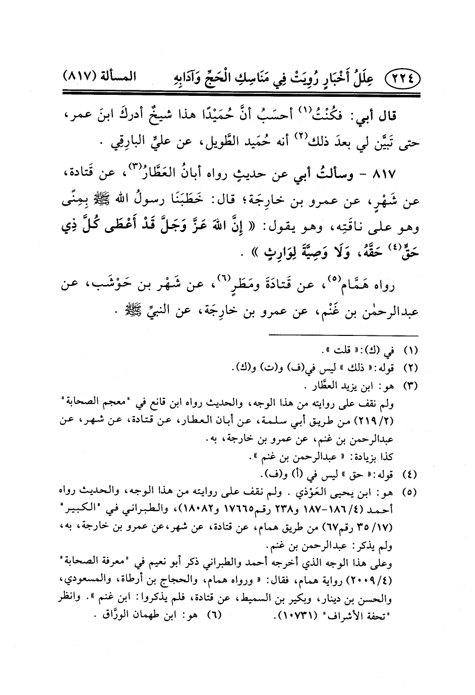 ٨١٧ - وسألتُ أَبِي عَنْ حديثٍ رَوَاهُ أبانُ العَطَّارُ (٣) ، عَنْ قَتادة، عَنْ شَهْرٍ، عن عمرو ابن خارِجَة؛ قال: خَطَبَنَا رسولُ الله (ص) بِمِنًى وَهُوَ عَلَى ناقَتِه، وَهُوَ يَقُولُ: إِنَّ اللهَ عَزَّ وَجَلَّ قَدْ أَعْطَى كُلَّ ذِي حَقٍّ (٤) حَقَّهُ، وَلَا وَصِيَّةَ لِوَارِثٍ.