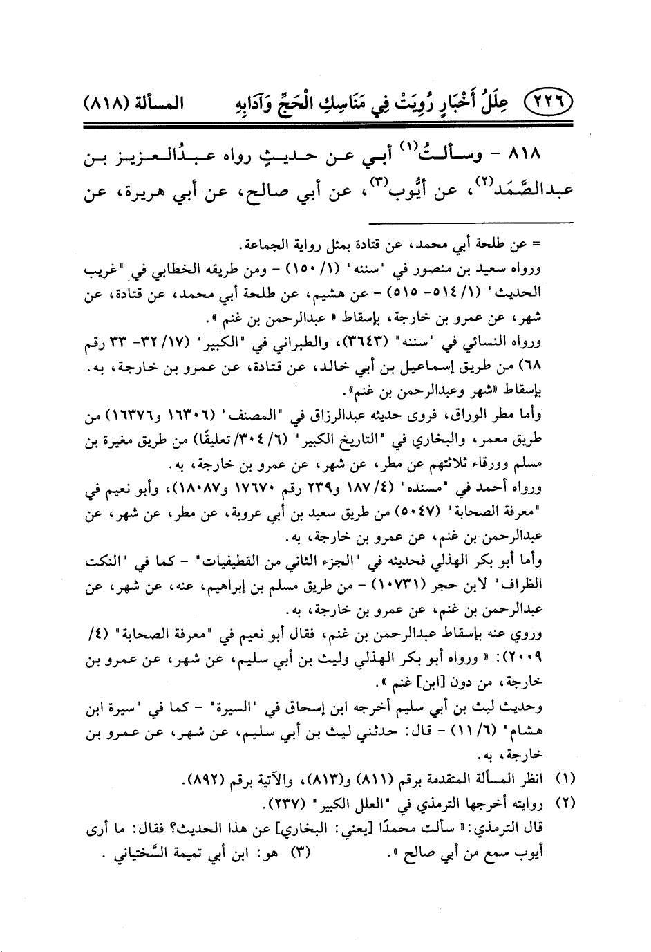 ٨١٨ - وسألتُ (١) أَبِي عَنْ حديثٍ رَوَاهُ عبدُالعزيز بن عبد الصَّمَد (٢) ، عَنْ أيُّوب (٣) ، عَنْ أَبِي صَالِحٍ، عن أبي هريرة، عن