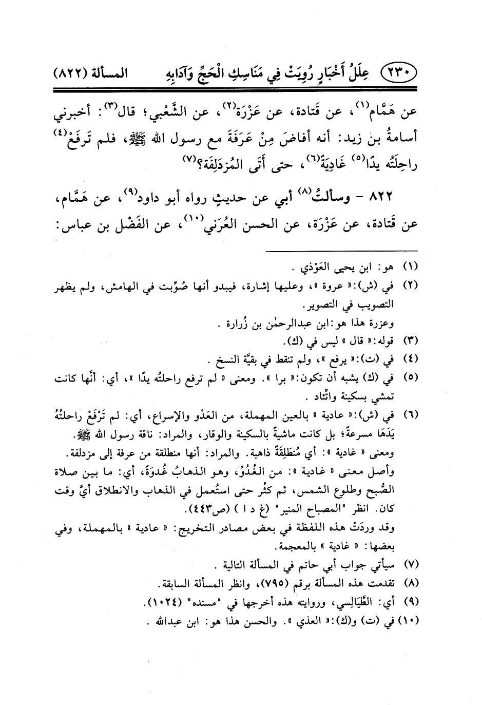 عَن هَمَّام (١) ، عَنْ قَتادة، عَنْ عَزْرَة (٢) ، عَنِ الشَّعْبي؛ قَالَ (٣) : أَخْبَرَنِي أسامةُ بْنُ زَيْدٍ: أَنَّهُ أفاضَ مِنْ عَرَفَةَ مَعَ رَسُولِ اللَّهِ (ص) ، فلم تَرفَعْ (٤) راحِلَتُه يَدًا (٥) غَادِيَةً (٦) ، حَتَّى أَتَى المُزدَلِفَة؟ (٧)