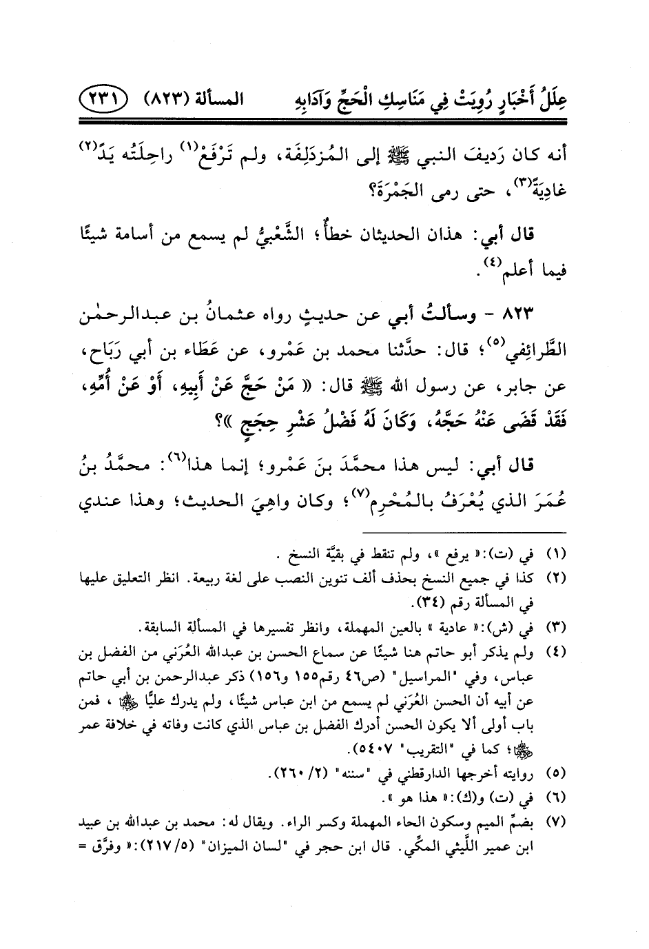 ٨٢٣ - وسألتُ أَبِي عَنْ حديثٍ رواه عثمانُ ابن عبد الرحمن الطَّرائِفي (٥) ؛ قَالَ: حدَّثنا مُحَمَّدُ بْنُ عَمْرو، عَنْ عَطَاء بْنِ أَبِي رَبَاح، عَنْ جَابِرٍ، عَنْ رَسُولِ الله (ص) قَالَ: مَنْ حَجَّ عَنْ أَبِيهِ، أَوْ عَنْ أُمِّهِ، فَقَدْ قَضَى عَنْهُ حَجَّهُ، وَكَانَ لَهُ فَضْلُ عَشْرِ حِجَجٍ؟