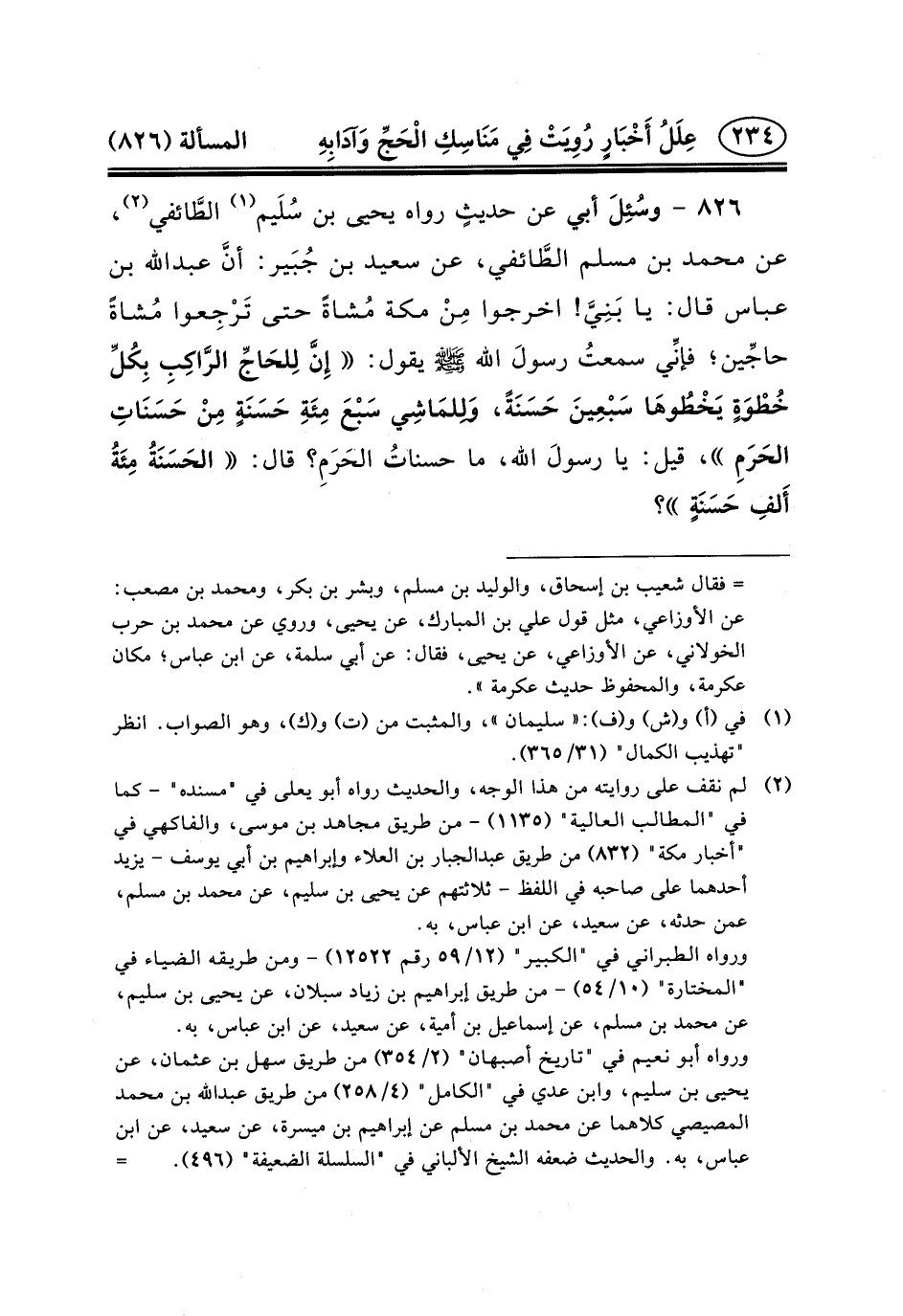 عَنْ مُحَمَّدِ بْنِ مُسْلِمٍ الطَّائفي، عَنْ سَعِيدِ بْنِ جُبَير: أنَّ عبد الله بْنَ عَبَّاسٍ قَالَ: يَا بَنِيَّ! اخْرُجُوا مِنْ مَكَّةَ مُشاةً حَتَّى تَرْجِعوا مُشاةً حاجِّين؛ فإنِّي سمعتُ رسولَ الله (ص) يَقُولُ: إِنَّ لِلحَاجِّ الرَّاكِبِ بِكُلِّ خُطْوَةٍ يَخْطُوهَا سَبْعِينَ حَسَنَةً، وَلِلمَاشِي سَبْعَ مِئَةِ حَسَنَةٍ مِنْ حَسَنَاتِ الحَرَمِ، قِيلَ: يا رسولَ الله، ما حسناتُ الحَرَمِ؟ قال: الحَسَنَةُ مِئَةُ أَلفِ حَسَنَةٍ؟