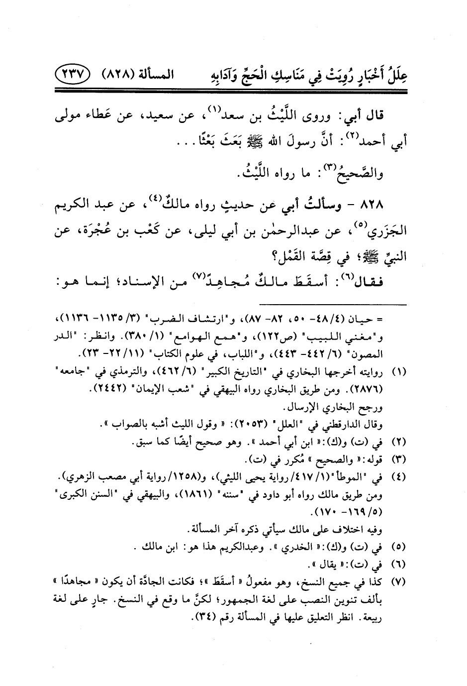 ٨٢٨ - وسألتُ أَبِي عَنْ حديثٍ رَوَاهُ مالكٌ (٤) ، عَنْ عَبْدِ الْكَرِيمِ الجَزَري (٥) ، عن عبد الرحمن بْنِ أَبِي لَيْلَى، عَنْ كَعْب بن عُجْرَة، عن النبيِّ (ص) ؛ فِي قِصَّة القَمْل؟