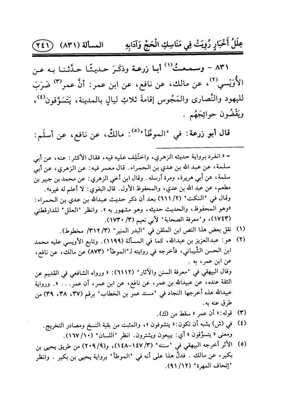 ٨٣١ - وسمعتُ (١) أَبَا زُرْعَةَ وذكَرَ حَدِيثًا حدَّثنا بِهِ عَنِ الأُوَيْسي (٢) ، عَنْ مَالِكٍ، عَنْ نَافِعٍ، عَنِ ابْنِ عُمَرَ: أنَّ عُمَرَ (٣) ضَرَبَ لِلْيَهُودِ والنَّصارى والمَجُوس إقامةَ ثلاثِ ليالٍ بِالْمَدِينَةِ، يَتَسَوَّقون (٤) ، ويَقْضُون حوائِجَهُم.