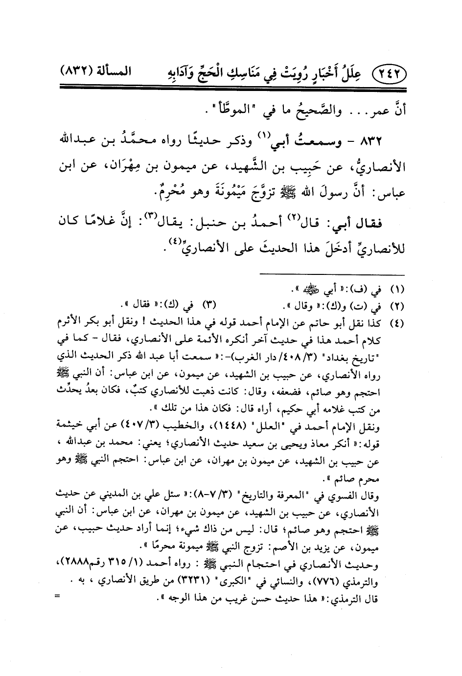 ٨٣٢ - وسمعتُ أَبِي (١) وَذَكَرَ حَدِيثًا رواه محمَّدُ بن عبد الله الأنصاريُّ، عَنْ حَبِيب بْنِ الشَّهيد، عَنْ مَيْمُونِ بْنِ مِهْرَان، عَنِ ابْنِ عَبَّاسٍ: أنَّ رسولَ اللَّهِ (ص) تزوَّجَ مَيْمُونَةَ وَهُوَ مُحْرِمٌ.