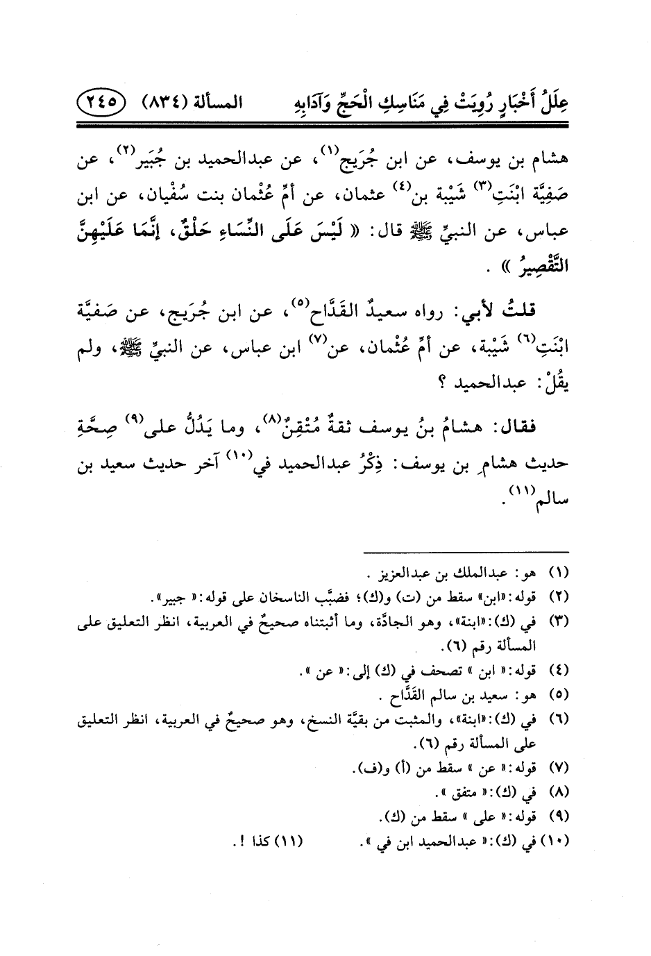 هِشَامِ بْنِ يُوسُفَ، عَنِ ابْنِ جُرَيج (١) ، عن عبد الحميد بن جُبَير (٢) ، عن صَفِيَّة ابْنَتِ (٣) شَيْبة بْنِ (٤) عُثْمَانَ، عَنْ أمِّ عُثْمان بِنْتِ سُفْيان، عَنِ ابْنِ عباس، عن النبيِّ (ص) قَالَ: لَيْسَ عَلَى النِّسَاءِ حَلْقٌ، إنَّمَا عَلَيْهِنَّ التَّقْصِيرُ.