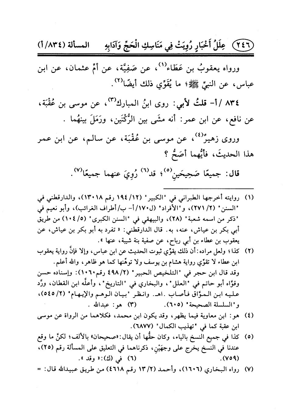 ٨٣٤/أ- قلتُ لأَبِي: رَوَى ابنُ الْمُبَارَكِ (٣) ، عَنْ مُوسَى بْنِ عُقْبَة، عَنْ نَافِعٍ، عَنِ ابْنِ عُمَرَ: أَنَّهُ مشَى بَيْنَ الرُّكْنَين، ورَمَلَ بينهُما.
