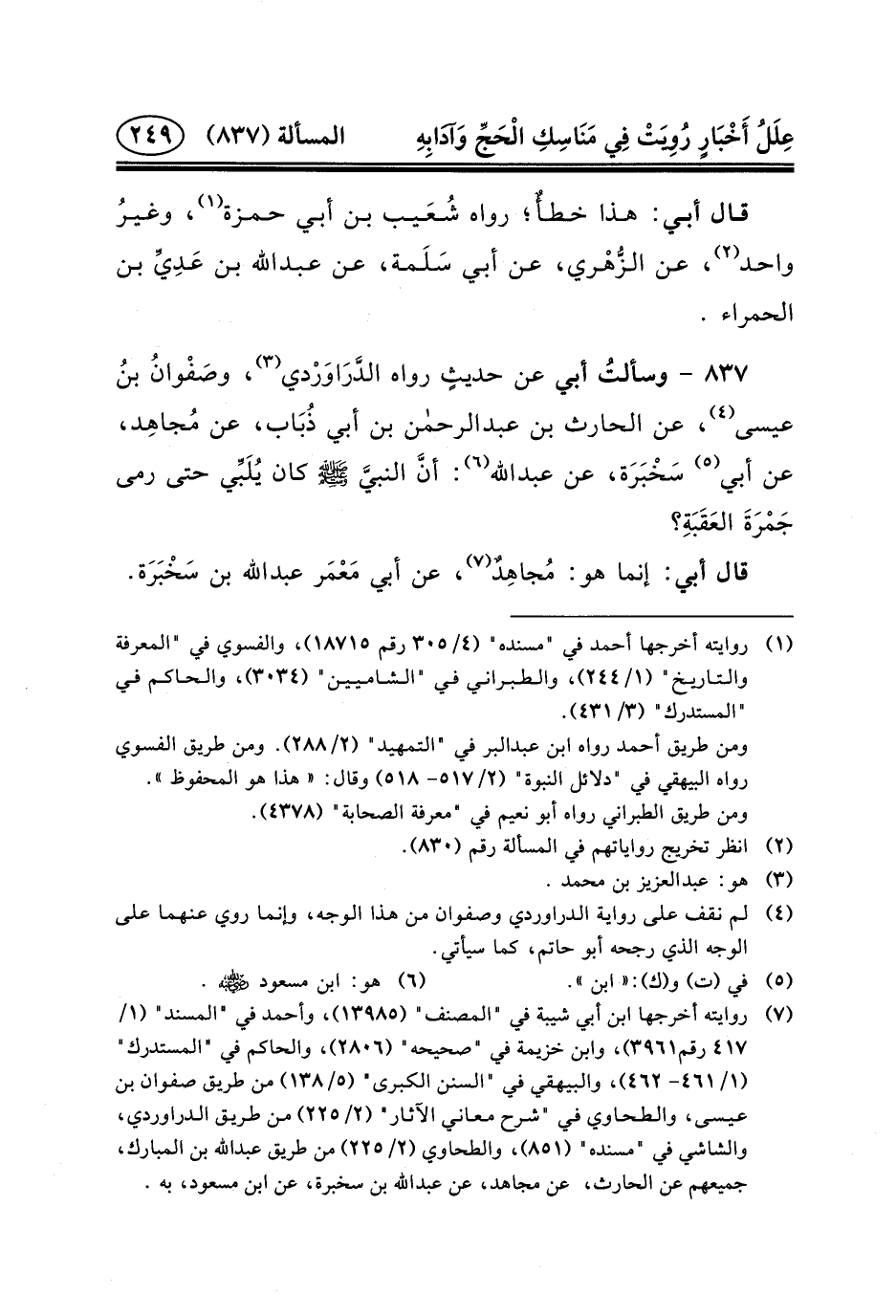 ٨٣٧ - وسألتُ أَبِي عَنْ حديثٍ رَوَاهُ الدَّرَاوَرْدي (٣) ، وصَفْوانُ بنُ عِيسَى (٤) ، عَنِ الْحَارِثِ بن عبد الرحمن بْنِ أَبِي ذُبَاب، عَنْ مُجاهِد، عن أبي (٥) سَخْبَرَة، عن عبد الله (٦) : أنَّ النبيَّ (ص) كَانَ يُلَبِّي حَتَّى رَمَى جَمْرَةَ العَقَبَةِ؟