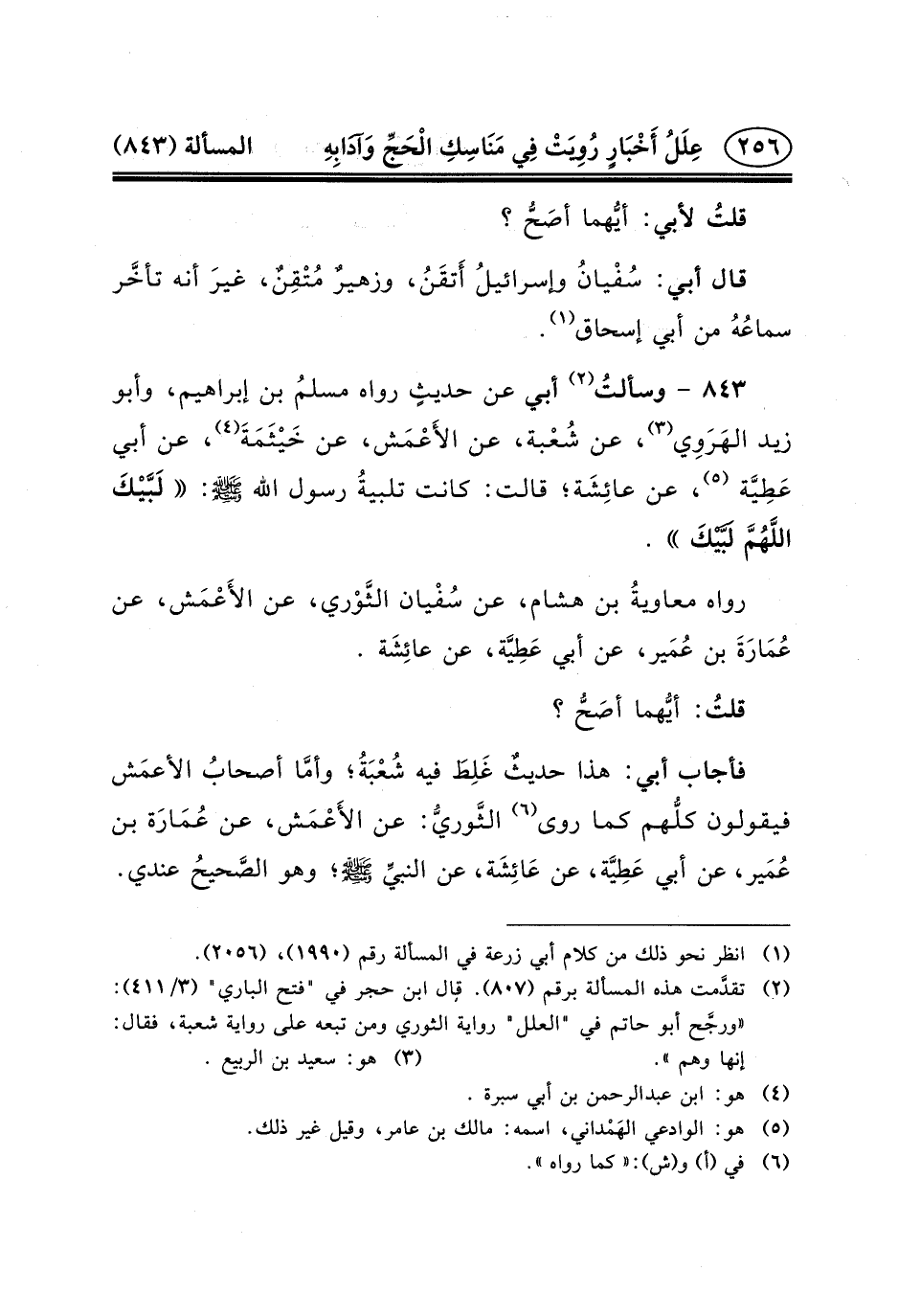 ٨٤٣ - وسألتُ (٢) أَبِي عَنْ حديثٍ رَوَاهُ مسلمُ بْنُ إِبْرَاهِيمَ، وَأَبُو زَيْدٍ الهَرَوِي (٣) ، عَنْ شُعْبة، عَنِ الأَعْمَش، عَنْ خَيْثَمَةَ (٤) ، عَنْ أَبِي عَطِيَّة (٥) ، عَنْ عائِشَة؛ قَالَتْ: كَانَتْ تلبيةُ رسول الله (ص) : لَبَّيْكَ اللَّهُمَّ لَبَّيْكَ.