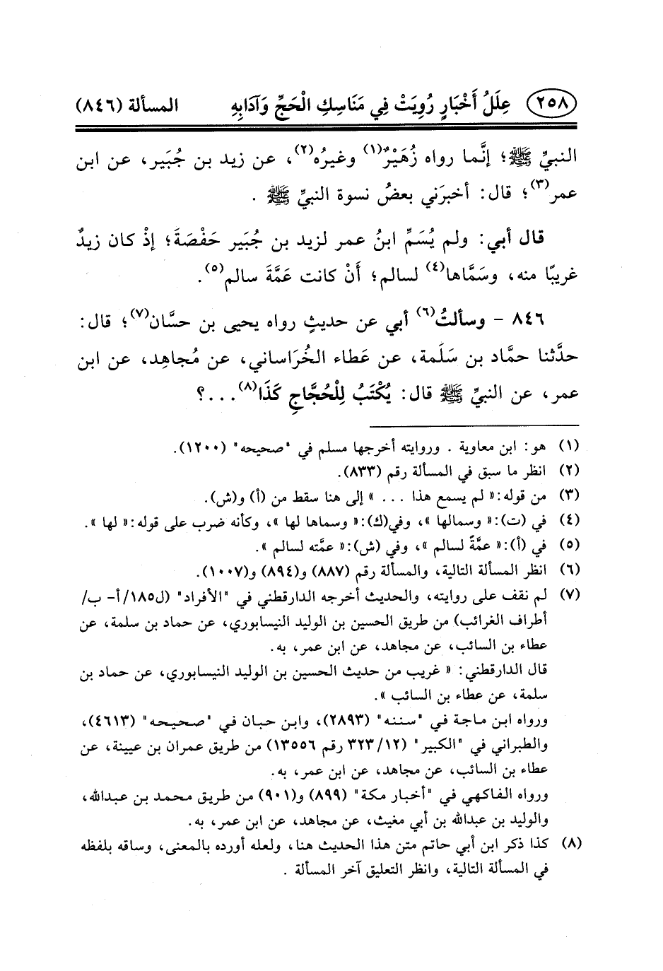 ٨٤٦ - وسألتُ (٦) أَبِي عَنْ حديثٍ رَوَاهُ يَحْيَى بْنُ حسَّان (٧) ؛ قَالَ: حدَّثنا حمَّاد بْنُ سَلَمة، عَنْ عَطاء الخُرَاساني، عَنْ مُجاهِد، عَنِ ابن عمر، عن النبيِّ (ص) قال: يُكْتَبُ لِلْحُجَّاجِ كَذَا (٨) ... ؟