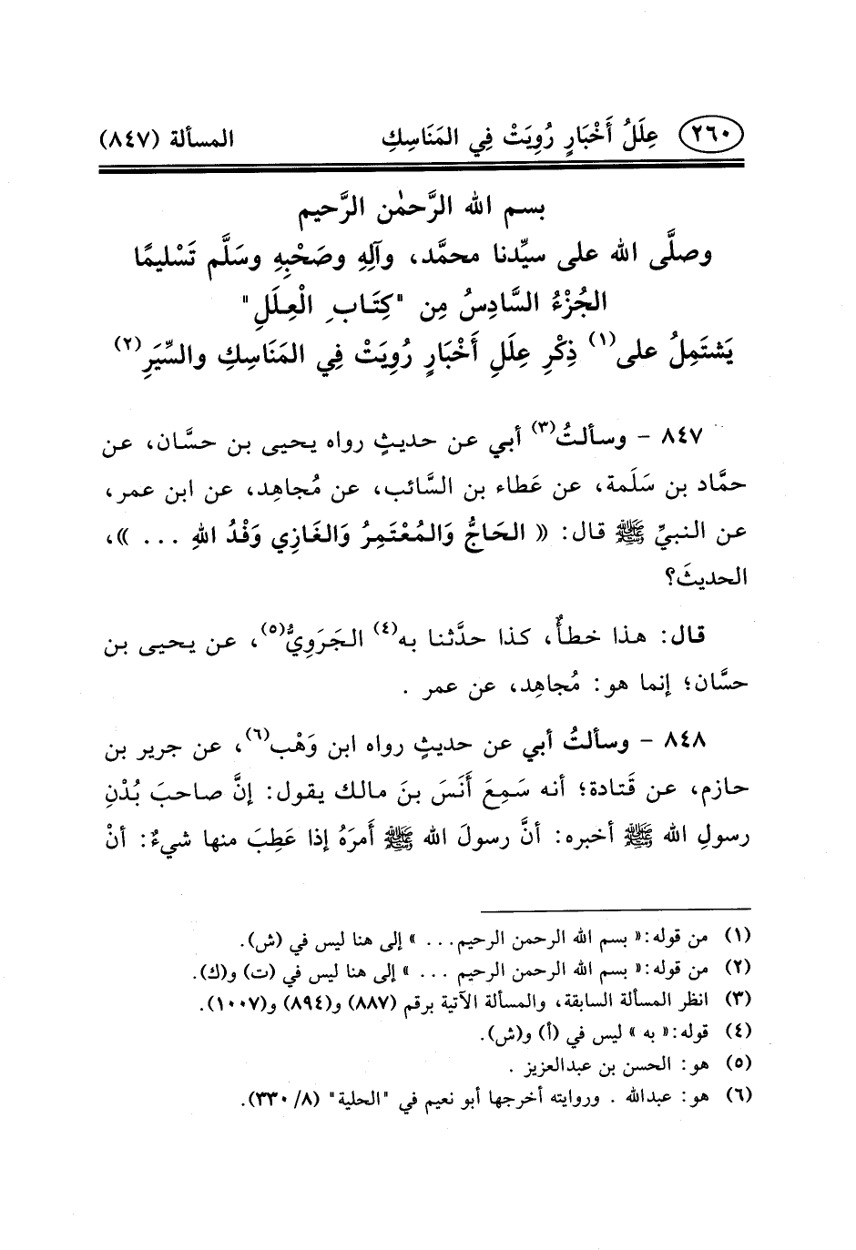 بسم الله الرَّحمن الرَّحيموصلَّى اللَّهُ عَلَى سيِّدنا محمَّد، وآلِهِ وصَحْبِهِ وسَلَّم تَسْليمًاالجُزْءُ السَّادِسُ مِن "كِتَاب ِ الْعِلَلِ"يَشتَمِلُ عَلَى (١) ذِكْرِ عِلَلِ أَخْبَارٍ رُوِيَتْ فِي المَنَاسِكِ والسِّيَرِ (٢)