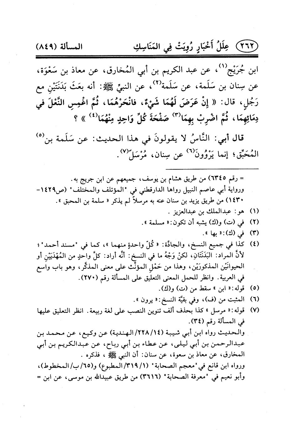 ابْنِ جُرَيْج (١) ، عَنْ عَبْدِ الْكَرِيمِ بْنِ أَبِي المُخارق، عَنْ مُعَاذِ بْنِ سَعْوَة، عَنْ سِنان بْنِ سَلَمة، عَنْ سَلَمة (٢) ، عَنِ النبيِّ (ص) : أَنَّهُ بعَثَ بَدَنَتَيْنِ مَعَ رَجُلٍ، قَالَ: إِنْ عَرَضَ لَهُمَا شَيْءٌ، فانْحَرْهُمَا، ثُمَّ اغْمِسِ النَّعْلَ فِي دِمَائِهِمَا، ثُمَّ اضْرِبْ بِهِمَا (٣) صَفْحَةَ كُلِّ وَاحِدٍ مِنْهُمَا (٤) ؟