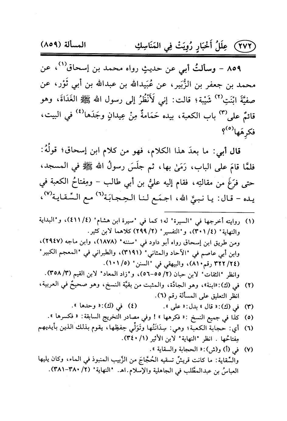 ٨٥٩ - وسألتُ أَبِي عَنْ حديثٍ رَوَاهُ محمد ابْنِ إِسْحَاقَ (١) ، عَنْ مُحَمَّدِ بْنِ جعفر بن الزُّبَير، عن عُبَيدالله بن عبد الله بْنِ أَبِي ثَوْر، عَنْ صفيَّةَ ابْنَتِ (٢) شَيْبة؛ قَالَتْ: إِنِّي لَأَنْظُرُ إِلَى رسول الله (ص) الغَدَاةَ، وَهُوَ قائمٌ عَلَى (٣) بَابِ الْكَعْبَةِ، بِيَدِهِ حَمَامةٌ مِنْ عِيدانٍ وجَدَها (٤) فِي الْبَيْتِ، فكرِهَها (٥) ؟