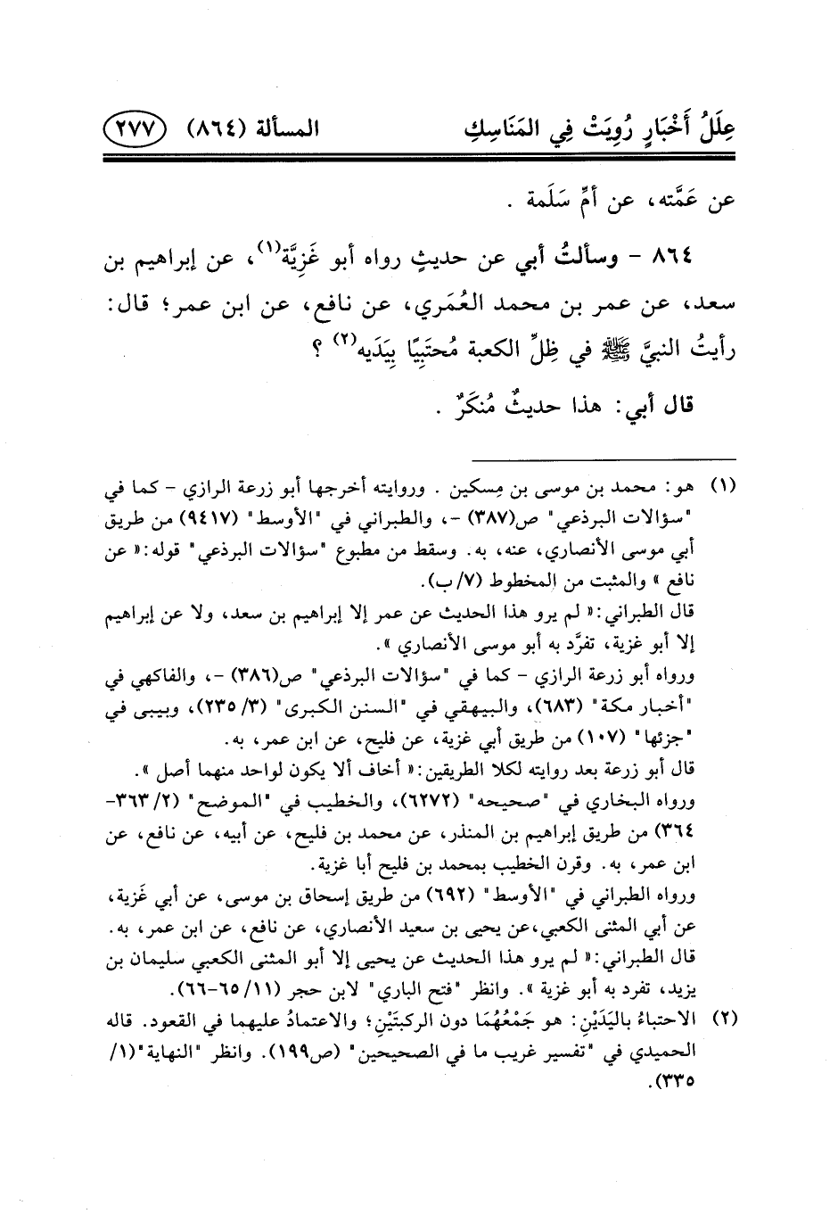 ٨٦٤ - وسألتُ أَبِي عَنْ حديثٍ رَوَاهُ أَبُو غَزِيَّة (١) ، عَنْ إِبْرَاهِيمَ بْنِ سَعْدٍ، عَنْ عُمَرَ بْنِ مُحَمَّدٍ العُمَري، عَنْ نَافِعٍ، عَنِ ابْنِ عمر؛ قال: رأيتُ النبيَّ (ص) فِي ظِلِّ الْكَعْبَةِ مُحتَبِيًا بِيَدَيه (٢) ؟