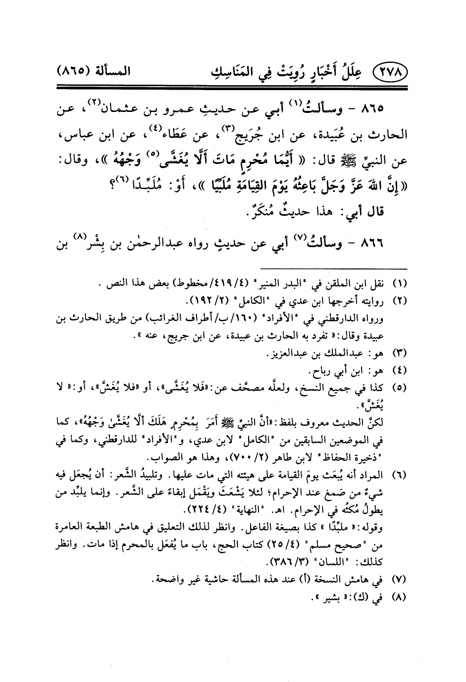 ٨٦٥ - وسألتُ (١) أَبِي عَنِ حديثِ عَمْرِو ابن عُثْمَانَ (٢) ، عَنِ الْحَارِثِ بْنِ عُبَيدة، عَنِ ابْنِ جُرَيج (٣) ، عَنْ عَطَاء (٤) ، عَنِ ابْنِ عَبَّاس، عَنِ النبيِّ (ص) قال: أَيُّمَا مُحْرِمٍ مَاتَ أَلَاّ يُغَشَّى (٥) وَجْهُهُ، وقال: إ ِنَّ اللهَ عَزَّ وَجَلَّ بَاعِثُهُ يَوْمَ القِيَامَةِ مُلَبِّيًا، أَوْ: مُلَبِّدًا (٦) ؟
