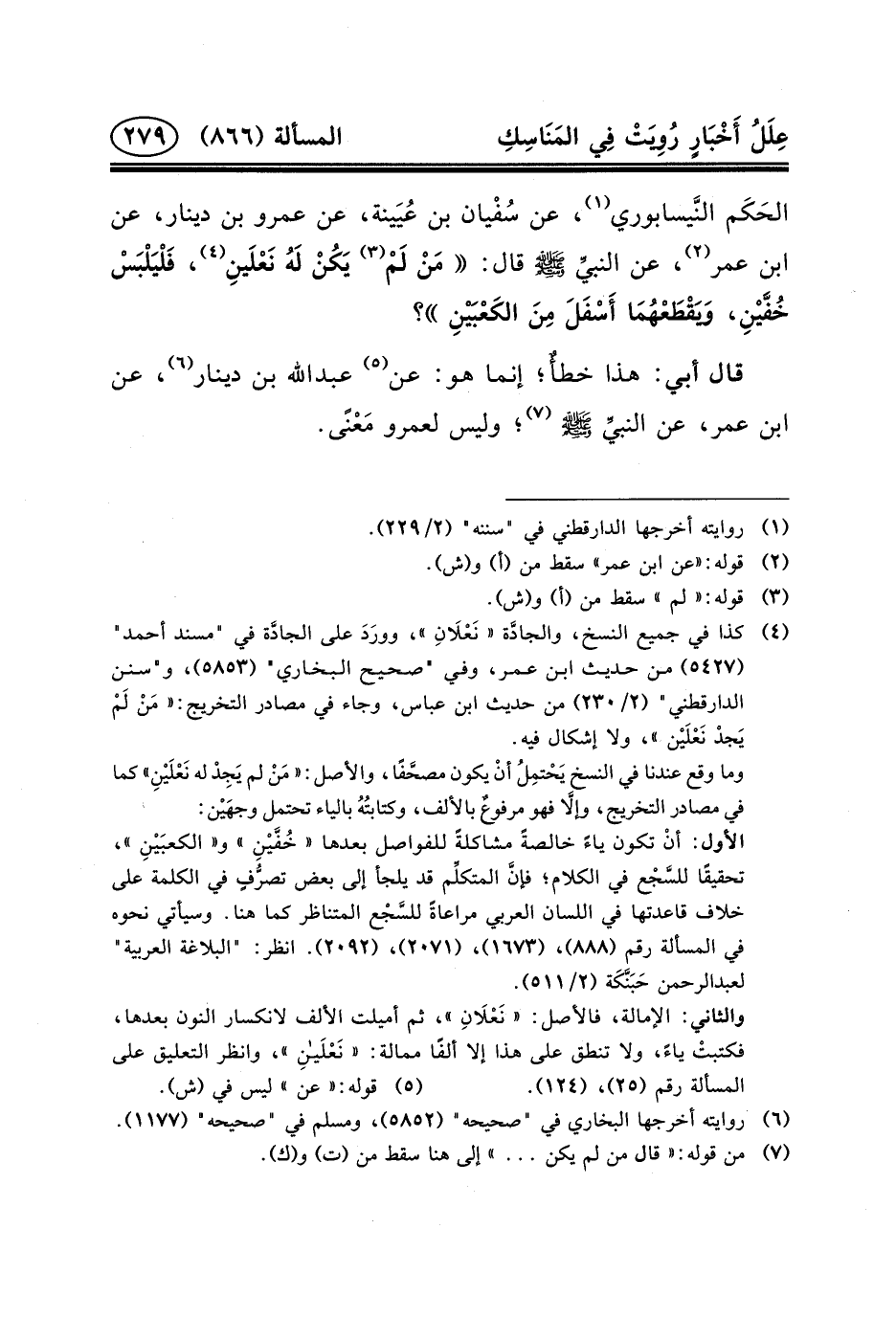 الحَكَم النَّيسابوري (١) ، عَنْ سُفْيان بْنِ عُيَينة، عن عمرو ابن دِينَارٍ، عَنِ ابْنِ عُمَرَ (٢) ، عَنِ النبيِّ (ص) قَالَ: مَنْ لَمْ (٣) يَكُنْ لَهُ نَعْلَينِ (٤) ، فَلْيَلْبَسْ خُفَّيْنِ، وَيَقْطَعْهُمَا أَسْفَلَ مِنَ الكَعْبَيْنِ؟