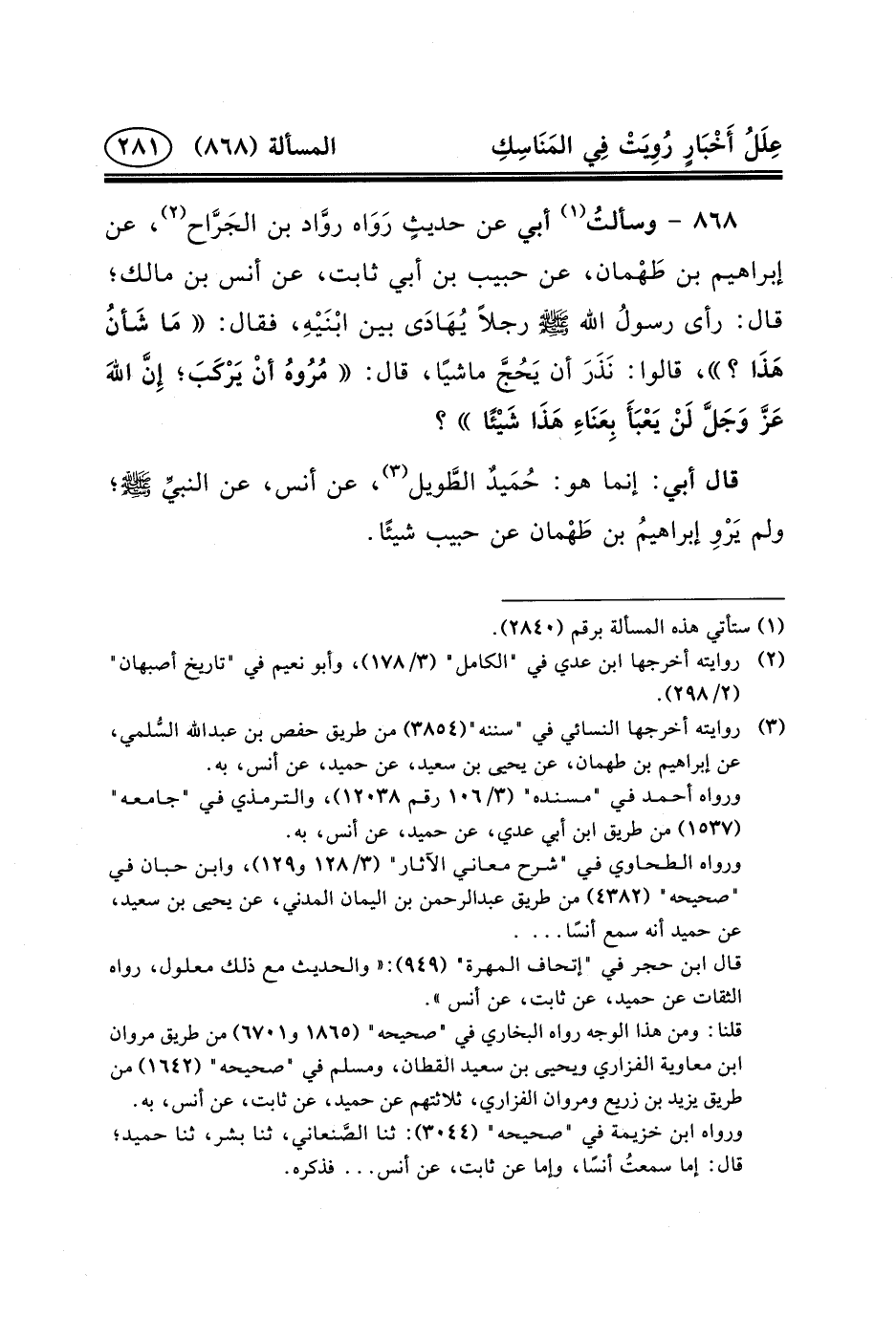 ٨٦٨ - وسألتُ (١) أَبِي عَنْ حديثٍ رَوَاه روَّاد بْنُ الجَرَّاح (٢) ، عَنْ إِبْرَاهِيمَ بْنِ طَهْمان، عَنْ حَبِيبِ بْنِ أَبِي ثَابِتٍ، عَنْ أَنَسِ بْنِ مَالِكٍ؛ قَالَ: رَأَى رسولُ اللَّهِ (ص) رَجُلا يُهَادَى بَيْنَ ابْنَيْهِ، فَقَالَ: مَا شَأنُ هَذَا؟ ، قَالُوا: نَذَرَ أَنْ يَحُجَّ مَاشِيًا، قَالَ: مُرُوهُ أنْ يَرْكَبَ؛ إِنَّ اللهَ عَزَّ وَجَلَّ لَنْ يَعْبَأَ بِعَنَاءِ هَذَا شَيْئًا؟