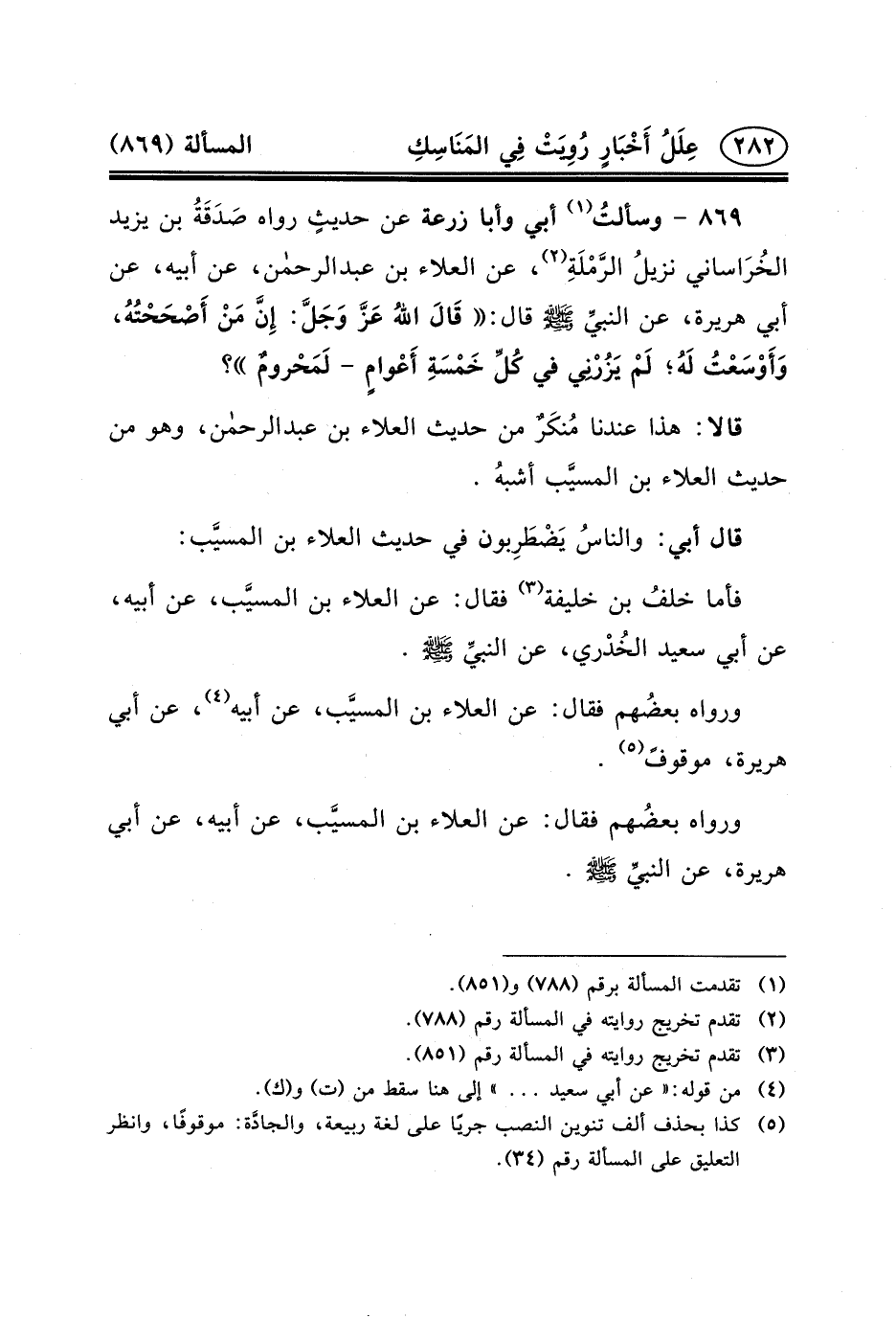 ٨٦٩ - وسألتُ (١) أَبِي وَأَبَا زُرْعَةَ عَنْ حديثٍ رَوَاهُ صَدَقَةُ بْنُ يَزِيدَ الخُرَاساني نزيلُ الرَّمْلَةِ (٢) ، عَنِ الْعَلاءِ بن عبد الرحمن، عَنْ أَبِيهِ، عَنْ أَبِي هُرَيْرَةَ، عن النبيِّ (ص) قَالَ: قَالَ اللهُ عَزَّ وَجَلَّ: إِنَّ مَنْ أَصْحَحْتُهُ، وَأَوْسَعْتُ لَهُ؛ لَمْ يَزُرْنِي فِي كُلِّ خَمْسَةِ أَعْوامٍ - لَمَحْرومٌ؟