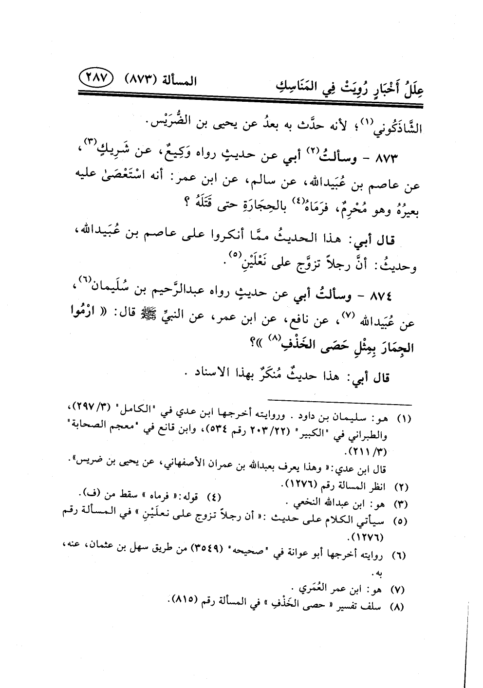 ٨٧٤ - وسألتُ أَبِي عَنْ حديثٍ رواه عبد الرَّحيم بن سُلَيمان (٦) ، عن عُبَيدالله (٧) ، عَنْ نَافِعٍ، عَنِ ابْنِ عُمَرَ، عن النبيِّ (ص) قال: ارْمُوا الجِمَارَ بِمِثْلِ حَصَى الخَذْفِ (٨) ؟