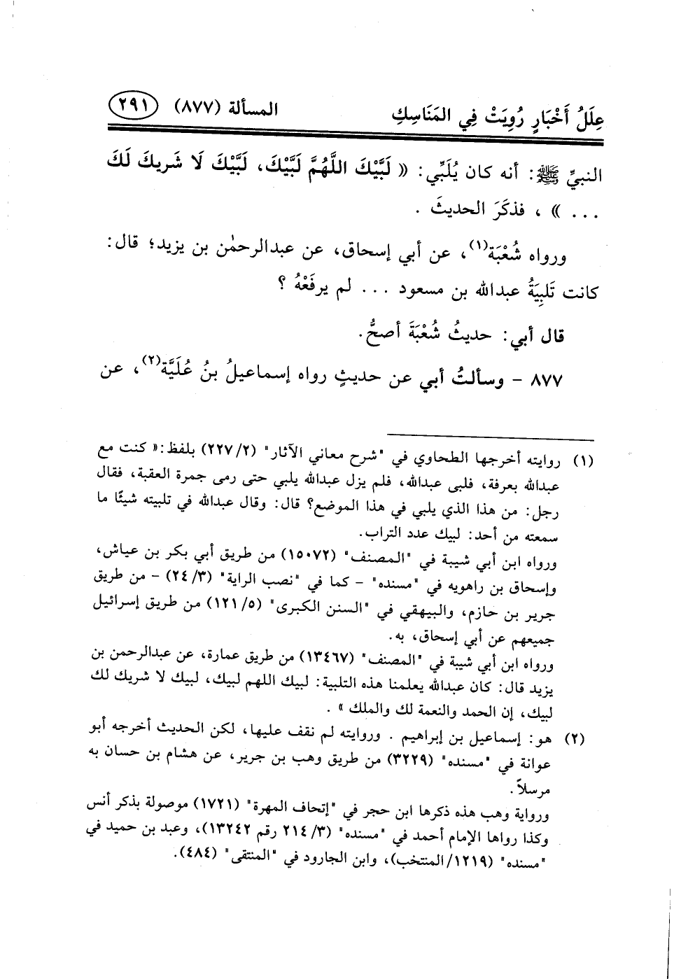 وَرَوَاهُ شُعْبَة (١) ، عَنْ أبي إسحاق، عن عبد الرحمن بْنِ يَزِيدَ؛ قَالَ: كَانَتْ تَلبِيَةُ عبد الله ابن مَسْعُودٍ ... لَمْ يرفَعْهُ؟
