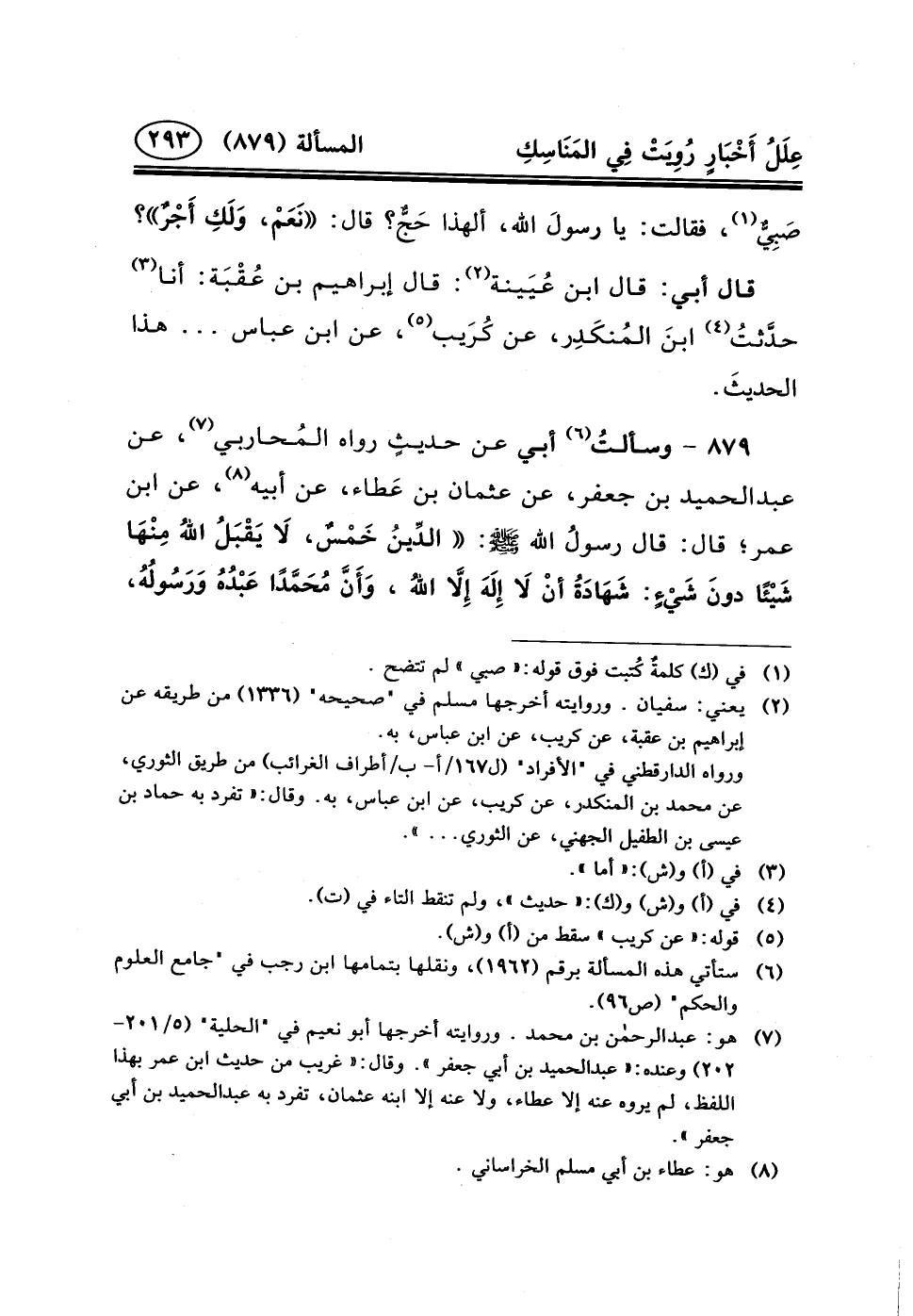 ٨٧٩ - وسألتُ (٦) أَبِي عَنْ حديثٍ رواه المُحاربي (٧) ، عن عبد الحميد بْنِ جَعْفَرٍ، عَنْ عُثْمَانَ بْنِ عَطاء، عَنْ أَبِيهِ (٨) ، عَنِ ابْنِ عُمَرَ؛ قَالَ: قَالَ رسولُ اللَّهِ (ص) : الدِّينُ خَمْسٌ، لَا يَقْبَلُ اللهُ مِنْهَا شَيْئًا دونَ شَيْءٍ: شَهَادَةُ أنْ لَا إِلَهَ إِلَاّ اللهُ، وَأَنَّ مُحَمَّدًا عَبْدُهُ وَرَسُولُهُ،