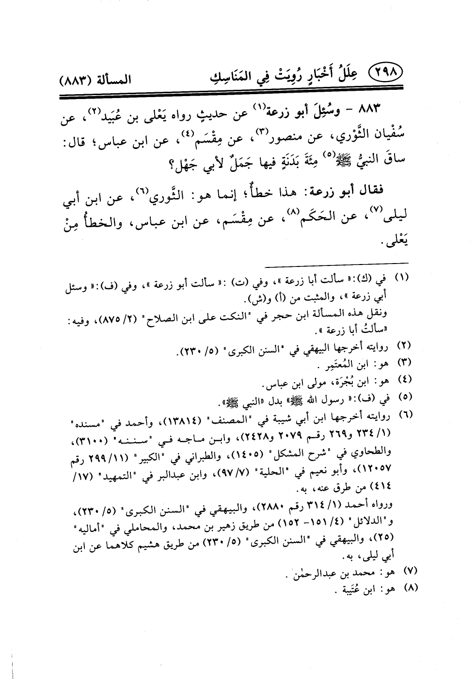 ٨٨٣ - وسُئِلَ أَبُو زُرْعَةَ (١) عَنْ حديثٍ رَوَاهُ يَعْلى بْنُ عُبَيد (٢) ، عَنْ سُفْيان الثَّوْري، عَنْ مَنْصُورٍ (٣) ، عَن مِقْسَم (٤) ، عَنِ ابْنِ عَبَّاسٍ؛ قَالَ: ساقَ النبيُّ (ص) (٥) مِئَةَ بَدَنَةٍ فِيهَا جَمَلٌ لأَبِي جَهْل؟