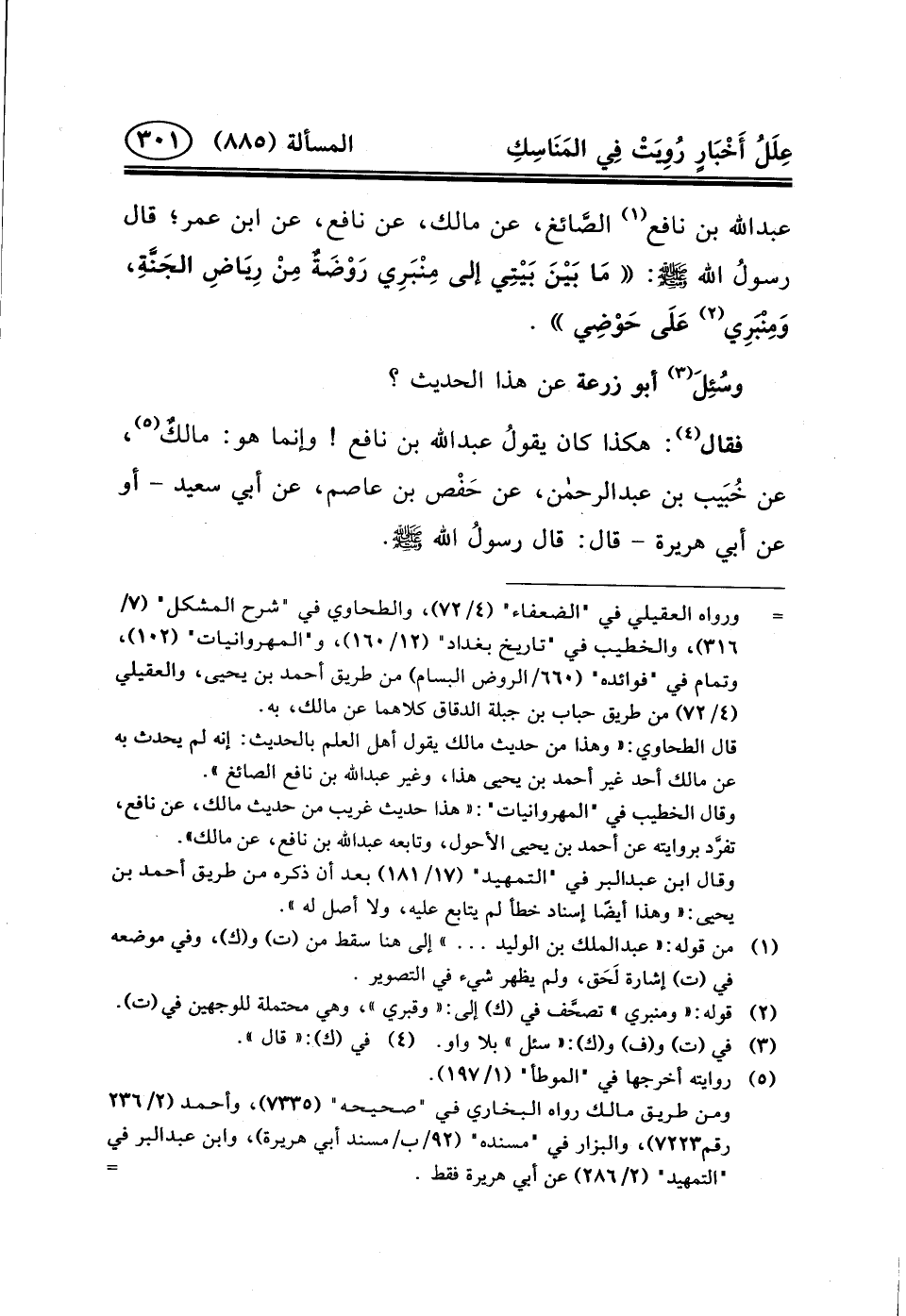 عبد الله بْنِ نَافِعٍ (١) الصَّائغ، عَنْ مَالِكٍ، عَنْ نَافِعٍ، عَنِ ابْنِ عُمَرَ؛ قال رسولُ الله (ص) : مَا بَيْنَ بَيْتِي إِلَى مِنْبَرِي رَوْضَةٌ مِنْ رِيَاضِ الجَنَّةِ، وَمِنْبَرِي (٢) عَلَى حَوْضِي.