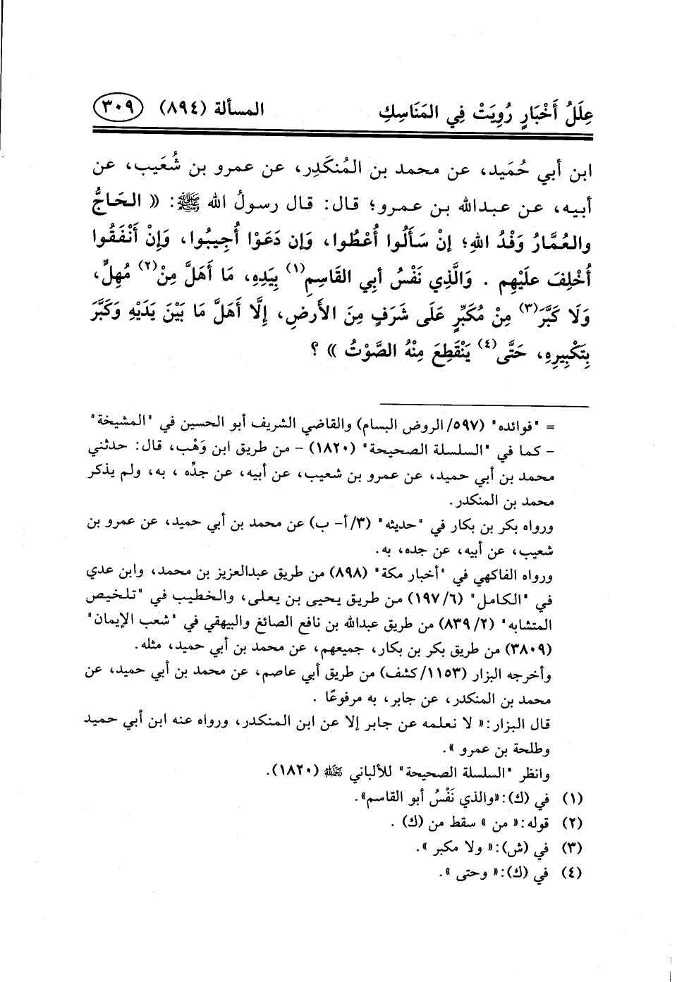 بْنِ أَبِي حُمَيد، عَنْ مُحَمَّدِ ابن المُنكَدِر، عَنْ عَمْرِو بْنِ شُعَيب، عن أبيه، عن عبد الله بْنِ عَمْرٍو؛ قَالَ: قَالَ رسولُ الله (ص) : الحَاجُّ والعُمَّارُ وَفْدُ اللهِ؛ إنْ سَأَلُوا أُعْطُوا، وَإن دَعَوْا أُجِيبُوا، وَإِنْ أَنْفَقُوا أُخْلِفَ علَيْهِم. وَالَّذِي نَفْسُ أبِي القَاسِمِ (١) بِيَدِهِ، مَا أَهَلَّ مِنْ (٢) مُهِلٍّ، وَلَا كَبَّرَ (٣) مِنْ مُكَبِّرٍ عَلَى شَرَفٍ مِنَ الأَرضِ، إِلَاّ أَهَلَّ مَا بَيْنَ يَدَيْهِ وَكَبَّرَ بِتَكْبِيرِهِ، حَتَّى (٤) يَنْقَطِعَ مِنْهُ الصَّوْتُ؟