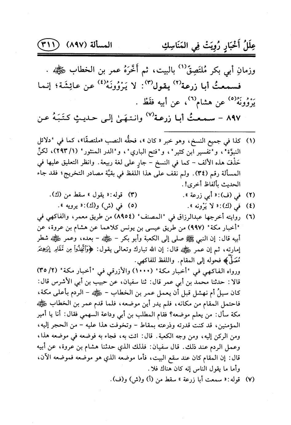(٦) روايته أخرجها عبد الرزاق في "المصنف" (٨٩٥٤) من طريق معمر، والفاكهي في "أخبار مكة" (٩٩٧) من طريق عيسى بن يونس كلاهما عَنْ هِشَامِ بْنِ عُرْوَةَ، عَنْ أبيه قال: إن النبي (ص) صلى إلى الكعبة وأبو بكر - ح - بعده، وعمر ح شطر إمارته، ثم إن عمر ح قال: إن الله تبارك وتعالى يقول: {وَاتَّخِذُوا مِنْ مَقَامِ إِبْرَاهِيمَ مُصَلّىً} فحوله إلى المقام. واللفظ للفاكهي.