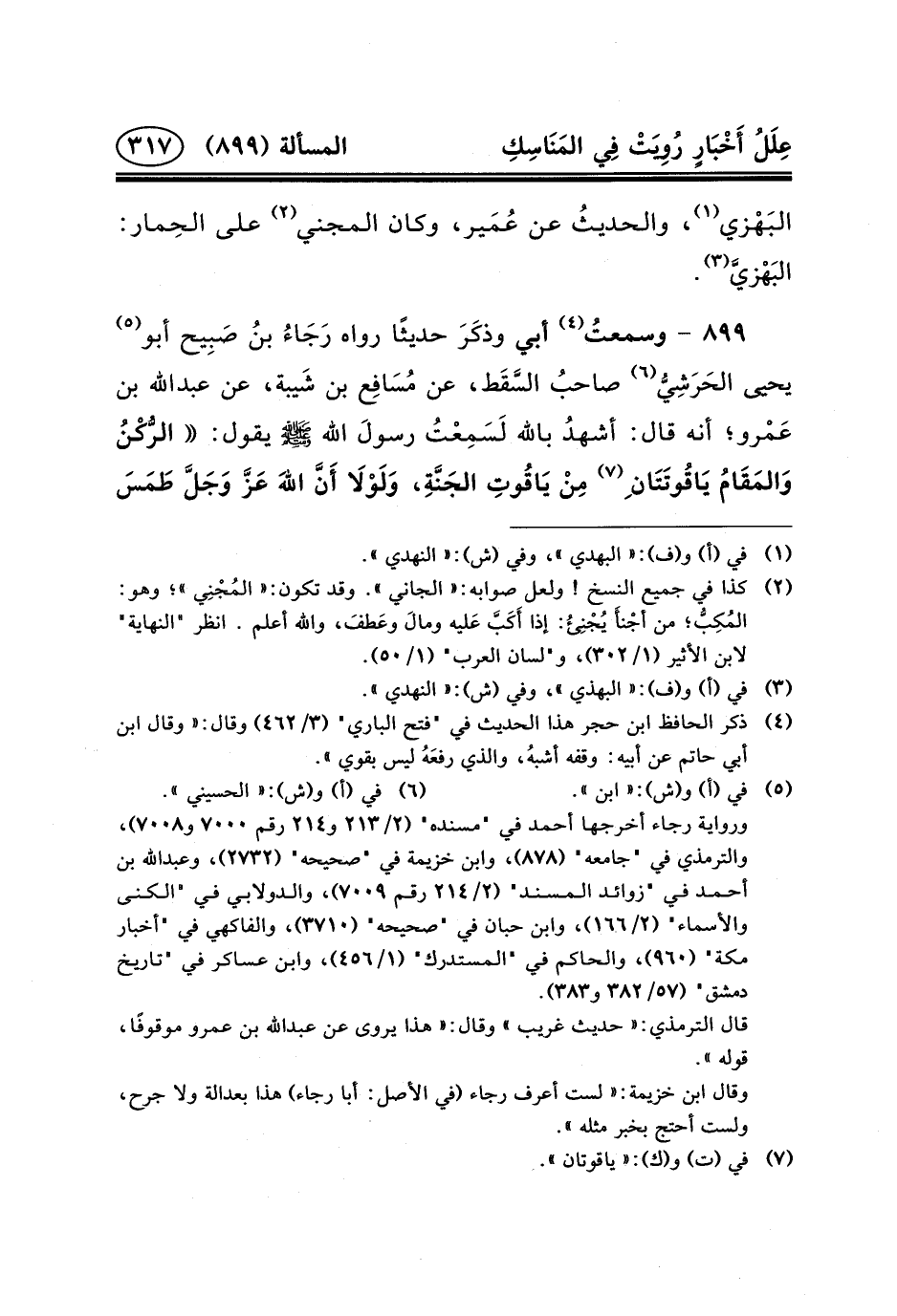 صاحبُ السَّقَط، عَنْ مُسَافِع بْنِ شَيبة، عن عبد الله بْنِ عَمْرو؛ أَنَّهُ قَالَ: أشهدُ بالله لَسَمِعْتُ رسولَ الله (ص) يقول: الرُّكْنُ وَالمَقَامُ يَاقُوتَتَان ِ (٧) مِنْ يَاقُوتِ الجَنَّةِ، وَلَوْلَا أَنَّ اللهَ عَزَّ وَجَلَّ طَمَسَ