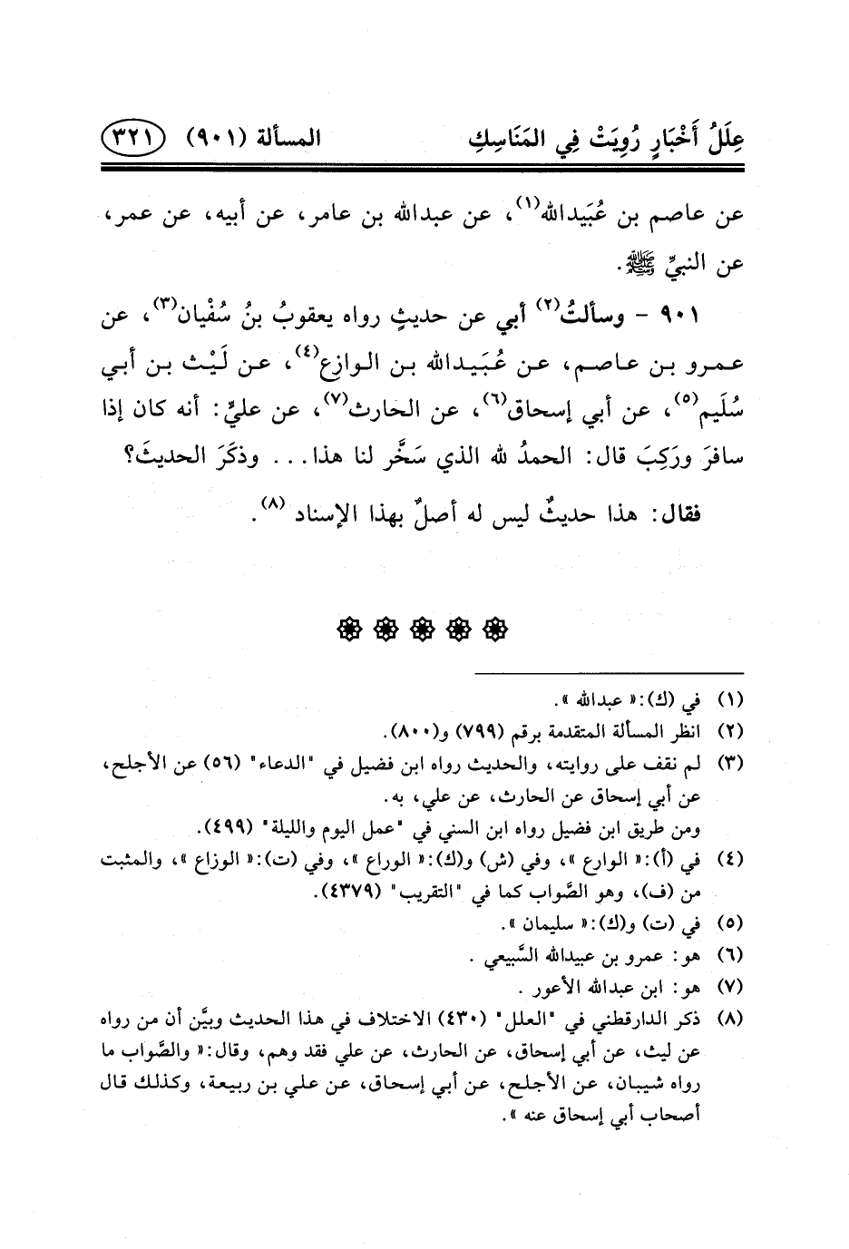 ٩٠١ - وسألتُ (٢) أَبِي عَنْ حديثٍ رَوَاهُ يعقوبُ بنُ سُفْيان (٣) ، عَنْ عَمْرِو بن عاصم، عن عُبَيدالله بْنِ الوازِع (٤) ، عَنْ لَيْث بْنِ أَبِي سُلَيم (٥) ، عَنْ أَبِي إِسْحَاقَ (٦) ، عَنِ الْحَارِثِ (٧) ، عَنْ عليٍّ: أَنَّهُ كَانَ إِذَا سافرَ ورَكِبَ قَالَ: الحمدُ لِلَّهِ الَّذِي سَخَّر لَنَا هَذَا ... وذكَرَ الحديثَ؟