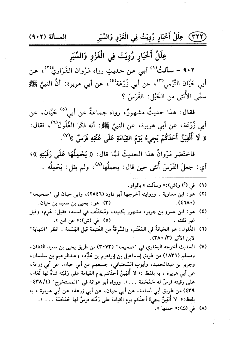 فَقَالَ: هَذَا حديثٌ مشهورٌ، رَوَاهُ جماعةٌ عَنْ أَبِي (٥) حَيَّان، عَنْ أَبِي زُرْعَة، عَنْ أَبِي هُرَيْرَةَ، عن النبيِّ (ص) : أَنَّهُ ذكَرَ الغُلُولَ (٦) ، فَقَالَ: لَا أُلْفِيَنَّ أَحَدَكُمْ يَجِيءُ يَوْمَ القِيَامَةِ عَلَى عُنُقِهِ فَرَسٌ (٧) .