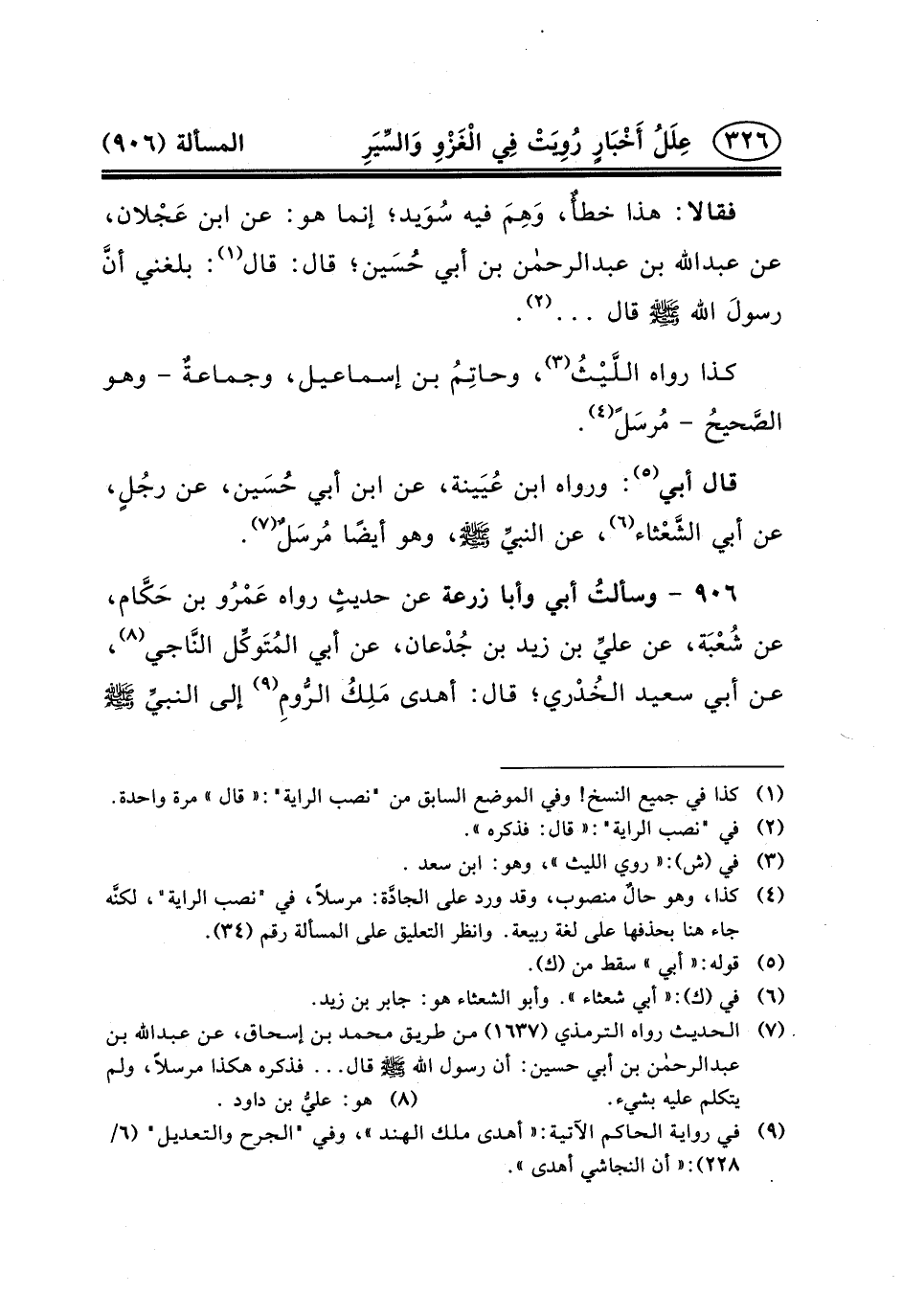 ٩٠٦ - وسألتُ أَبِي وَأَبَا زُرْعَةَ عَنْ حديثٍ رَوَاهُ عَمْرُو بْنُ حَكَّام، عَنْ شُعْبَة، عَنْ عليِّ بْنِ زَيْدِ بْنِ جُدْعان، عَنْ أَبِي المُتَوكِّل النَّاجي (٨) ، عَنْ أَبِي سَعِيدٍ الخُدْري؛ قَالَ: أَهْدَى مَلِكُ الرُّومِ (٩) إِلَى النبيِّ (ص)