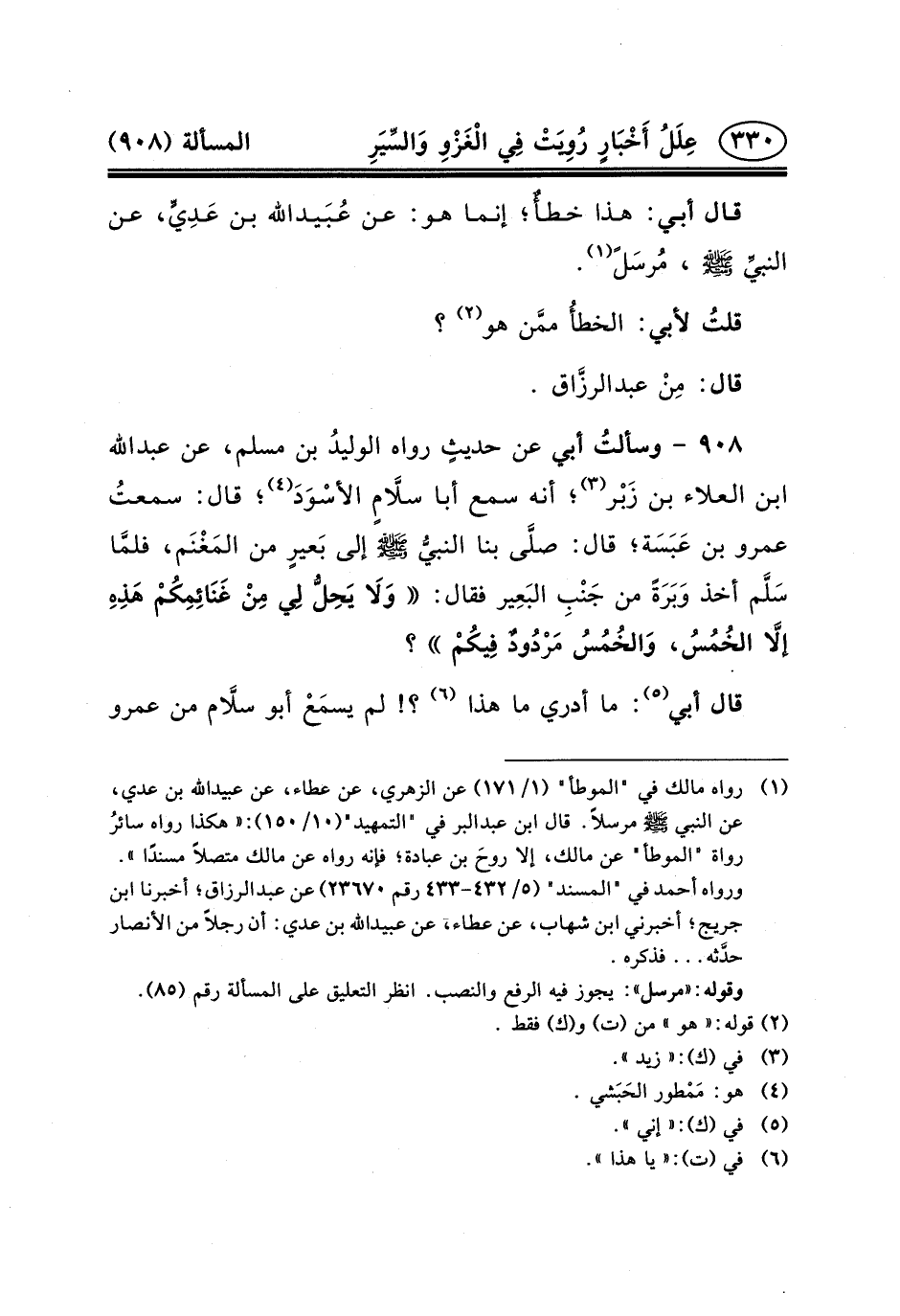 ٩٠٨ - وسألتُ أَبِي عَنْ حديثٍ رَوَاهُ الوليدُ ابن مسلم، عن عبد الله بْنِ الْعَلاءِ بْنِ زَبْر (٣) ؛ أَنَّهُ سَمِعَ أَبَا سلَاّمٍ الأسْوَدَ (٤) ؛ قَالَ: سمعتُ عَمْرَو بْنَ عَبَسَة؛ قَالَ: صلَّى بنا النبيُّ (ص) إِلَى بَعيرٍ مِنَ المَغْنَم، فلمَّا سَلَّم أَخَذَ وَبَرَةً مِنْ جَنْبِ البَعِير فَقَالَ: وَلَا يَحِلُّ لِي مِنْ غَنَائِمِكُمْ هَذِهِ إلَاّ الخُمُسُ، وَالخُمُسُ مَرْدُودٌ فِيكُمْ؟