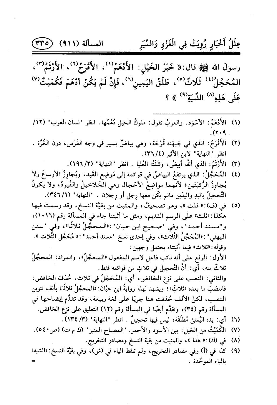 رسولَ الله (ص) قَالَ: خَيْرُ الخَيْلِ: الأَدْهَمُ (١) ، الأَقْرَحُ (٢) ، الأَرْثَمُ (٣) ، المُحَجَّلُ (٤) ثَلَاثً (٥) ،