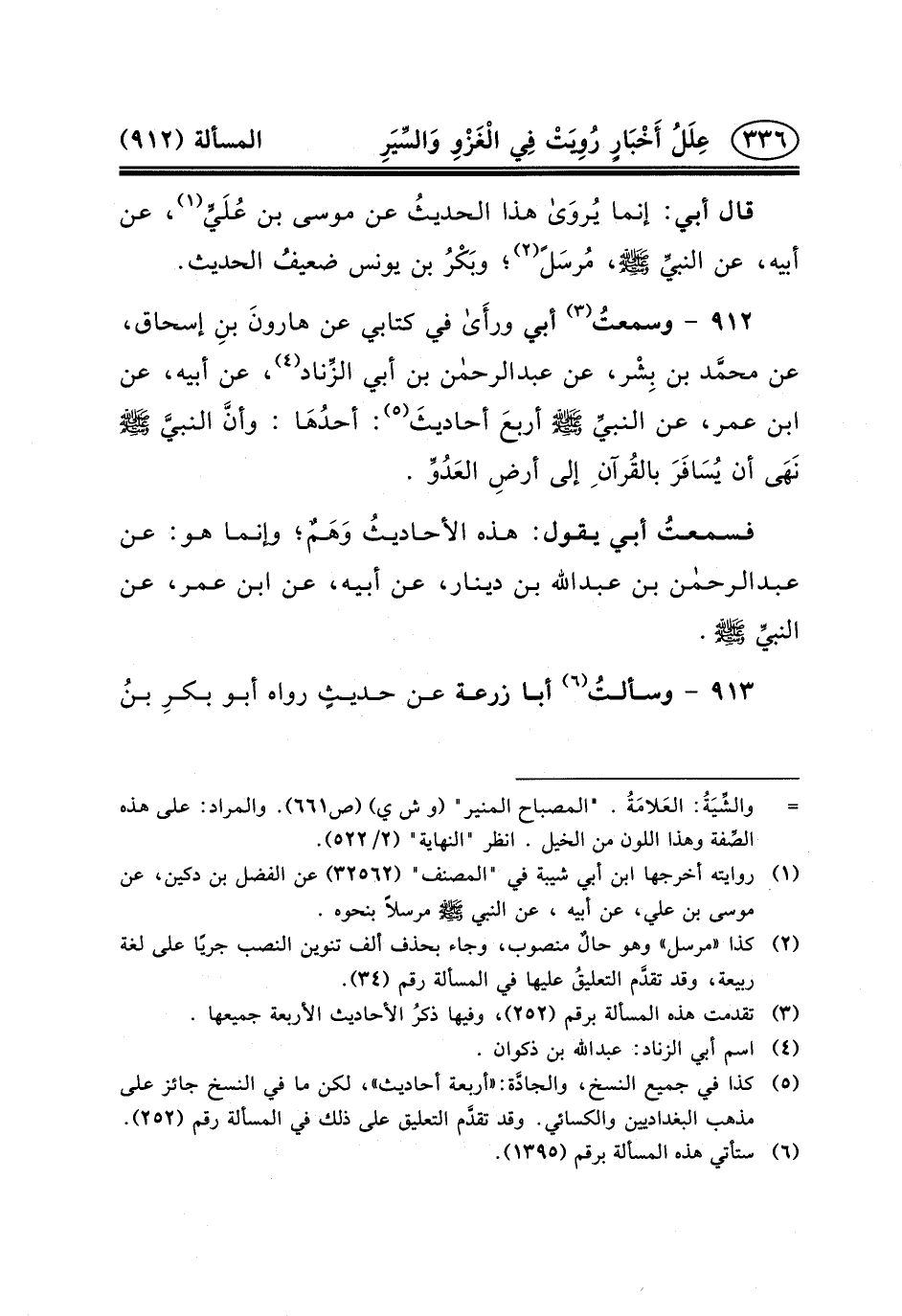 ٩١٢ - وسمعتُ (٣) أَبِي ورأَى فِي كِتَابِي عَنْ هارونَ بنِ إِسْحَاقَ، عَنْ محمَّد بْنِ بِشْر، عَنْ عبد الرحمن بْنِ أَبِي الزِّناد (٤) ، عَنْ أَبِيهِ، عَنِ ابْنِ عُمَرَ، عَنِ النبيِّ (ص) أربعَ أحاديثَ (٥) : أحدُهَا: وأنَّ النبيَّ (ص) نَهَى أن يُسَافَرَ بالقُرآن ِ إِلَى أرضِ العَدُوِّ.
