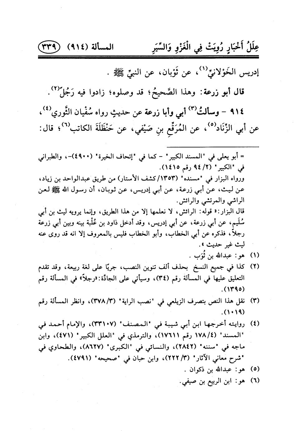 ٩١٤ - وسألتُ (٣) أَبِي وَأَبَا زُرْعَةَ عَنْ حديثٍ رَوَاهُ سُفْيان الثَّوري (٤) ، عَنْ أَبِي الزِّنَاد (٥) ، عَنِ المُرَقِّعِ بنِ صَيْفي، عَنْ حَنْظَلَةَ الْكَاتِبِ (٦) ؛ قَالَ: