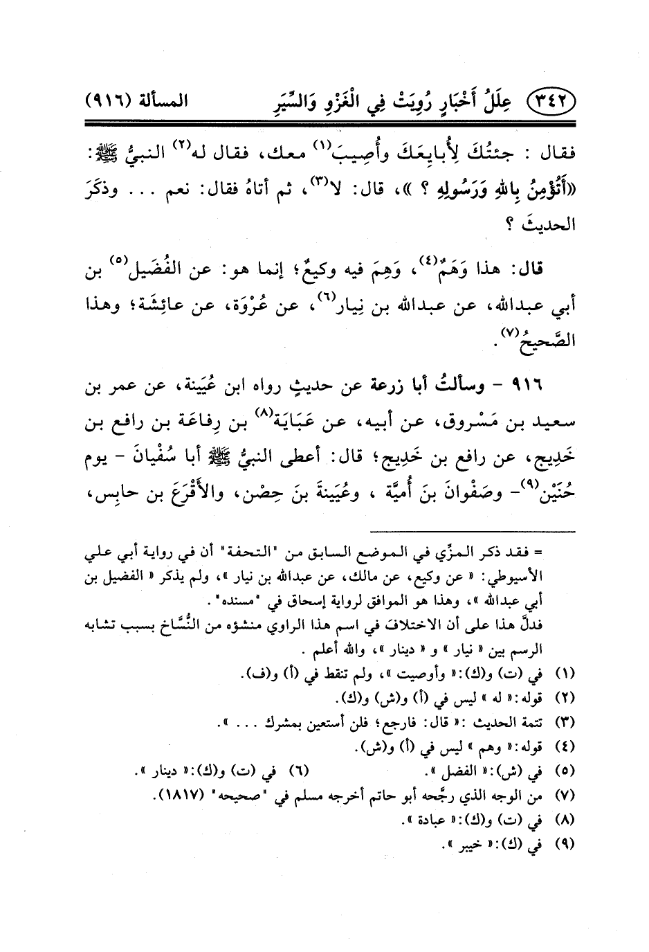 ٩١٦ - وسألتُ أَبَا زرعة عَنْ حديثٍ رَوَاهُ ابْنُ عُيَينة، عَنْ عُمَرَ بْنِ سَعِيدِ بْنِ مَسْروق، عَنْ أَبِيهِ، عَنْ عَبَايَة (٨) بْنِ رِفاعَة بْنِ رَافِعِ بْنِ خَدِيج، عَنْ رَافِعِ بْنِ خَدِيج؛ قال: أعطى النبيُّ (ص) أَبَا سُفْيانَ - يَوْمَ حُنَيْن (٩) - وصَفْوانَ بنَ أُميَّة، وعُيَينةَ بنَ حِصْن، والأَقْرَعَ بن حابِس،