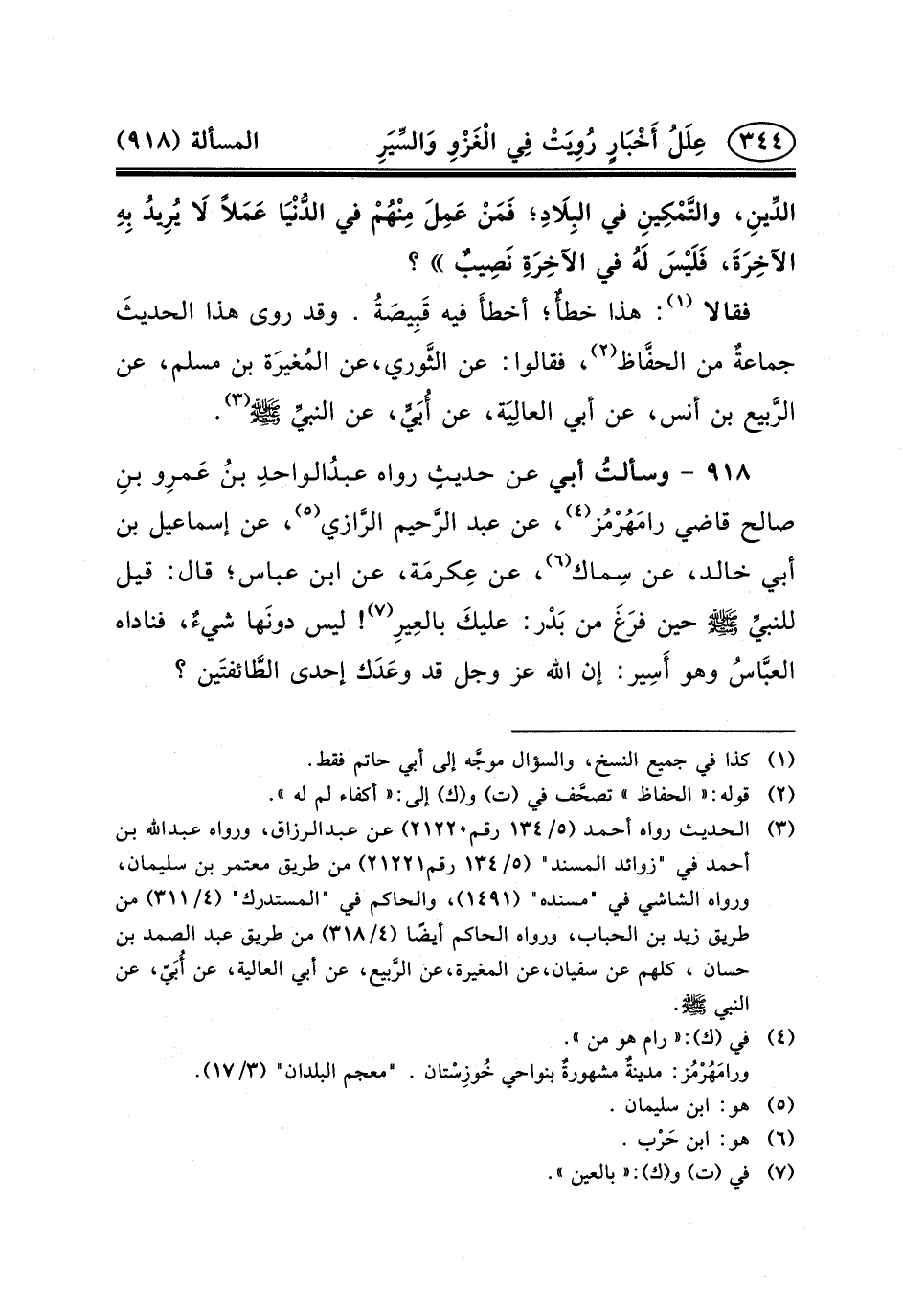 ٩١٨ - وسألتُ أَبِي عَنْ حديثٍ رَوَاهُ عبدُالواحدِ بنُ عَمرِو بنِ صَالِحٍ قَاضِي رامَهُرْمُز (٤) ، عَنْ عَبْدِ الرَّحيم الرَّازي (٥) ، عَنْ إِسْمَاعِيلَ بْنِ أَبِي خَالِدٍ، عَنْ سِماك (٦) ، عَنْ عِكرمَة، عَنِ ابْنِ عَبَّاسٍ؛ قَالَ: قِيلَ للنبيِّ (ص) حِينَ فرَغَ مِنْ بَدْر: عليكَ بالعِيرِ (٧) ! لَيْسَ دونَها شيءٌ، فَنَادَاهُ العبَّاسُ وَهُوَ أَسِير: إِنَّ اللَّهَ عَزَّ وَجَلَّ قَدْ وعَدَك إِحْدَى الطَّائفتَين؟