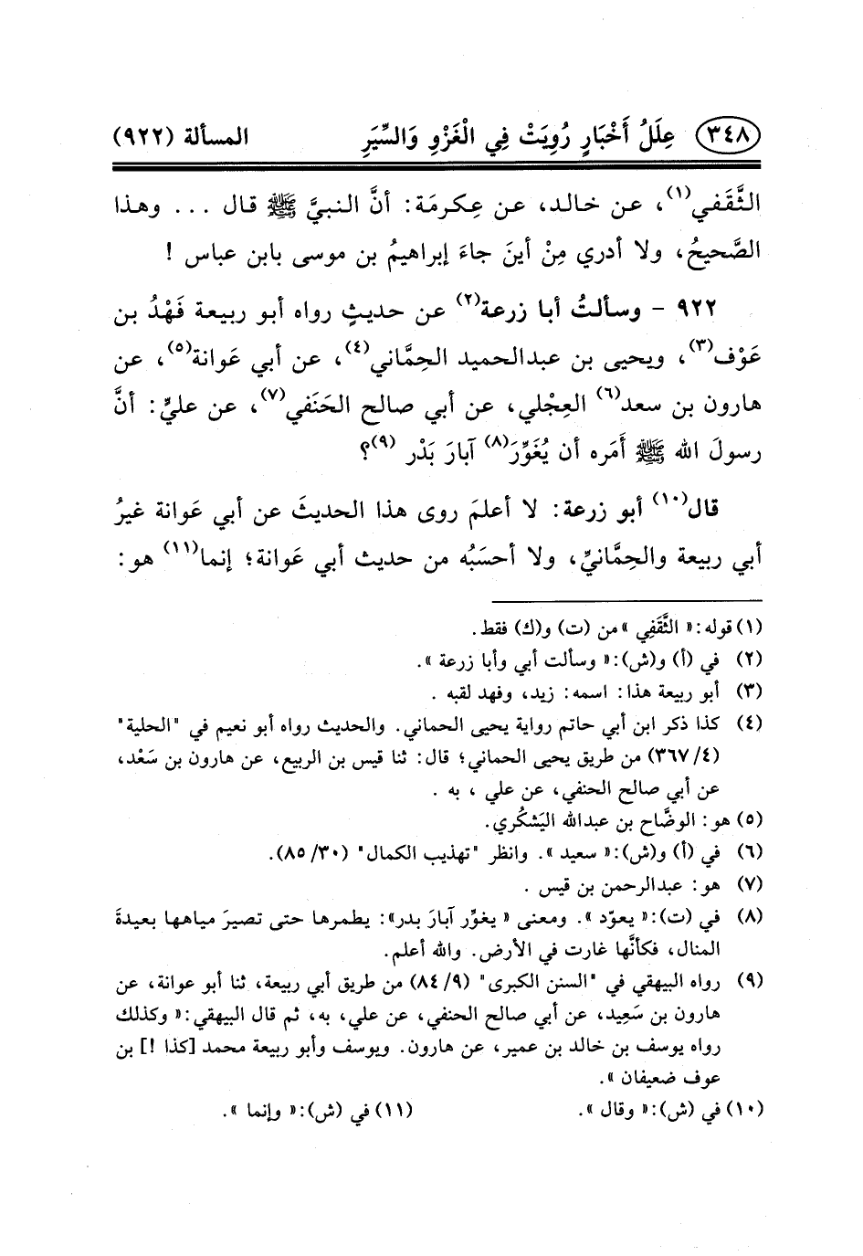 ٩٢٢ - وسألتُ أَبَا زُرْعَةَ (٢) عَنْ حديثٍ رَوَاهُ أَبُو رَبِيعَةَ فَهْدُ بْنُ عَوْف (٣) ، وَيَحْيَى بن عبد الحميد الحِمَّاني (٤) ، عَنْ أَبِي عَوانة (٥) ، عَنْ هَارُونَ بْنِ سَعْدٍ (٦) العِجْلي، عَنْ أَبِي صَالِحٍ الحَنَفي (٧) ، عَنْ عليٍّ: أنَّ رسولَ الله (ص) أَمَره أَنْ يُغَوِّرَ (٨) آبارَ بَدْر (٩) ؟