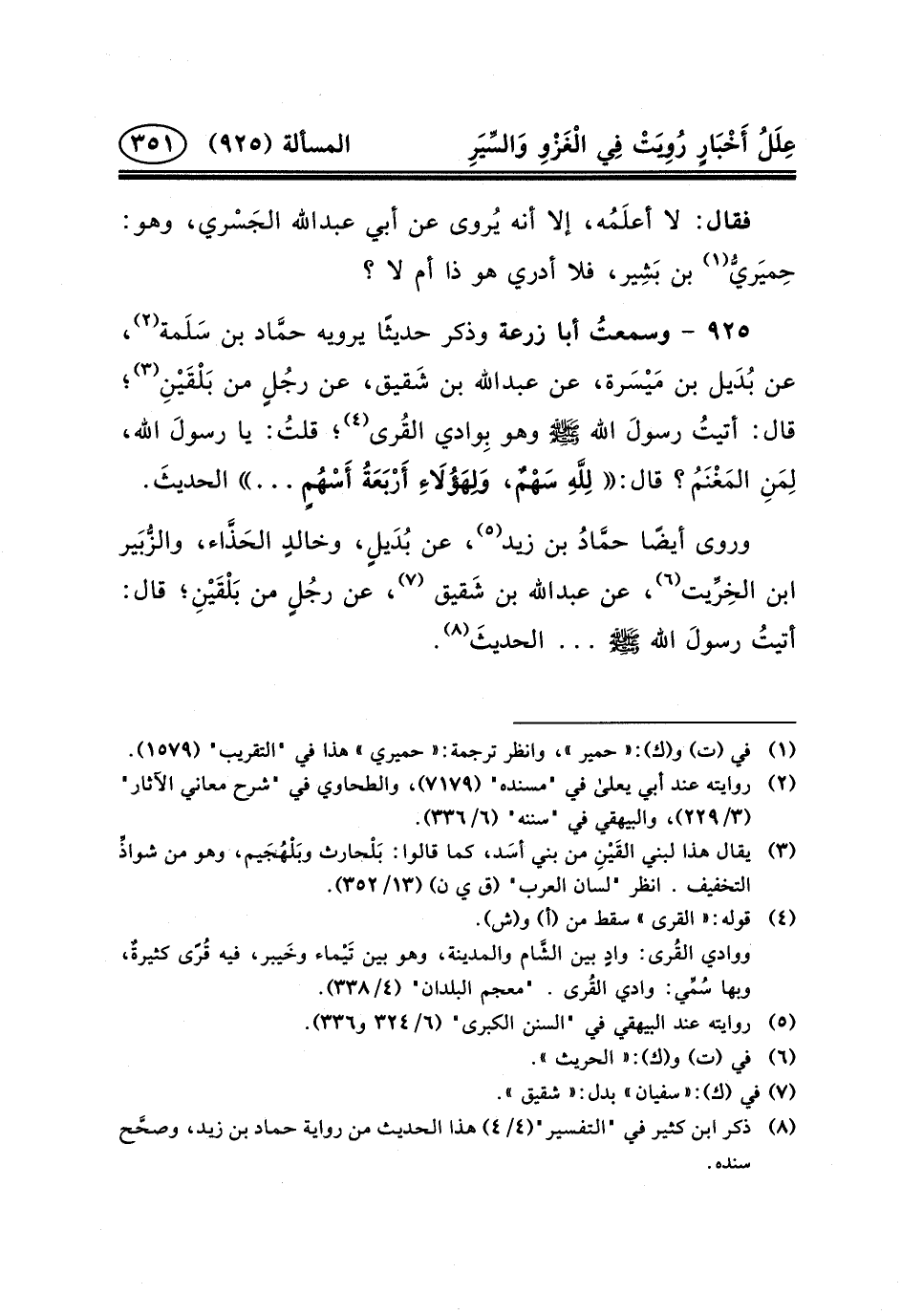 ٩٢٥ - وسمعتُ أَبَا زُرْعَةَ وَذَكَرَ حَدِيثًا يَرْوِيهِ حمَّاد بْنُ سَلَمة (٢) ، عَنْ بُدَيل بْنِ مَيْسَرة، عَنْ عبد الله بْنِ شَقيق، عَنْ رجُلٍ مِنْ بَلْقَيْنِ (٣) ؛ قَالَ: أتيتُ رسولَ اللَّهِ (ص) وَهُوَ بِوادي القُرى (٤) ؛ قلتُ: يَا رسولَ اللَّهِ، لِمَنِ المَغْنَمُ؟ قَالَ: لِلَّهِ سَهْمٌ، وَلِهَؤُلَاءِ أَرْبَعَةُ أَسْهُمٍ ... الحديثَ.