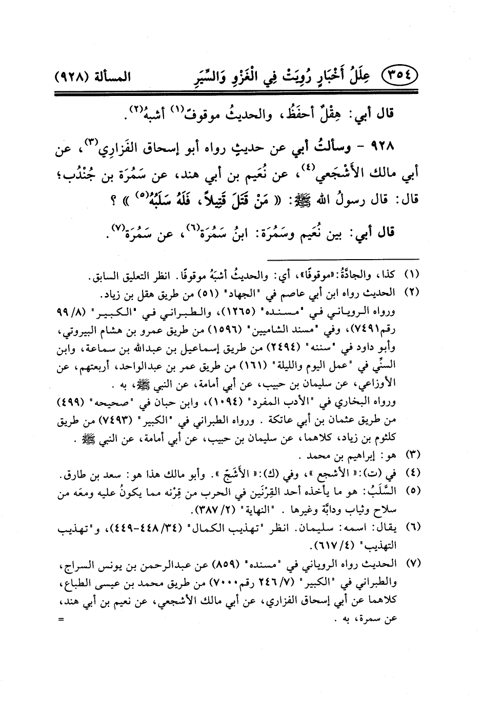 ٩٢٨ - وسألتُ أَبِي عَنْ حديثٍ رَوَاهُ أَبُو إِسْحَاقَ الفَزارِي (٣) ، عَنْ أَبِي مَالِكٍ الأَشْجَعي (٤) ، عَنْ نُعَيم بْنِ أَبِي هِنْدٍ، عَنْ سَمُرَة ابن جُنْدُب؛ قَالَ: قَالَ رسولُ اللَّهِ (ص) : مَنْ قَتَلَ قَتِيلاً، فَلَهُ سَلَبُهُ (٥) ؟