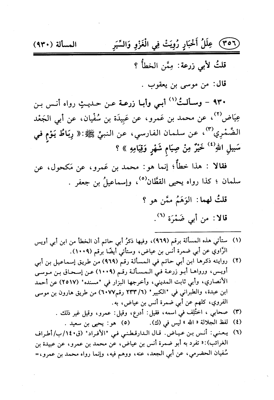 ٩٣٠ - وسألتُ (١) أَبِي وَأَبَا زُرْعَةَ عَنْ حديثٍ رَوَاهُ أَنَسُ بْنُ عِيَاض (٢) ، عن محمد ابن عَمرو، عَنْ عَبِيدَة بْنِ سُفْيان، عَنْ أَبِي الجَعْد الضَّمْرِي (٣) ، عَنْ سلمان الفارسي، عن النبيِّ (ص) : رِبَاطُ يَوْمٍ فِي سَبيلِ اللهِ (٤) خَيْرٌ مِنْ صِيَامِ شَهْرٍ وَقِيَامِهِ؟