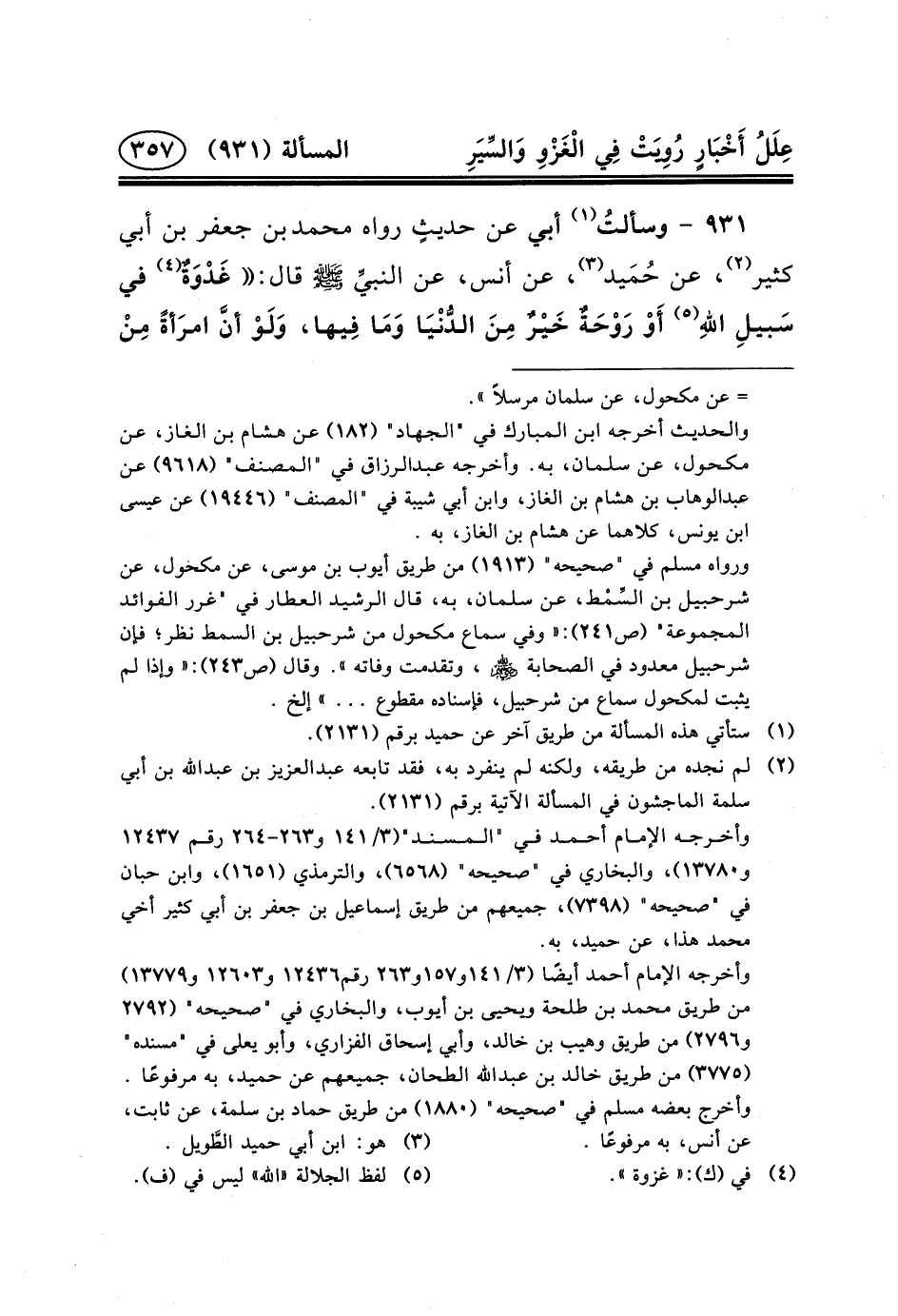 ٩٣١ - وسألتُ (١) أَبِي عَنْ حديثٍ رَوَاهُ مُحَمَّدُ بْنُ جَعْفَرِ بْنِ أَبِي كَثِيرٍ (٢) ، عَنْ حُمَيد (٣) ، عَنْ أَنَسٍ، عن النبيِّ (ص) قَالَ: غَدْوَةٌ (٤) فِي سَبيلِ اللهِ (٥) أَوْ رَوْحَةٌ خَيْرٌ مِنَ الدُّنْيَا وَمَا فِيها، وَلَوْ أنَّ امرَأةً مِنْ