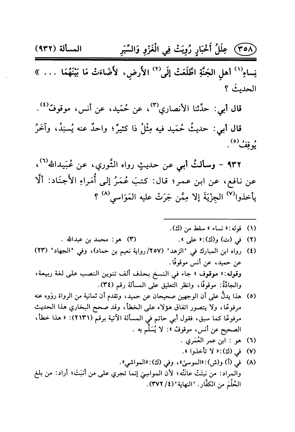 ٩٣٢- وسألتُ أَبِي عَنْ حديثٍ رواه الثَّوري، عن عُبَيدالله (٦) ، عَنْ نَافِعٍ، عَنِ ابْنِ عُمَرَ؛ قَالَ: كتبَ عُمَرُ إِلَى أُمَراءِ الأَجنَاد: ألَاّ يَأْخُذُوا (٧) الجِزْيَةَ إِلا مِمَّن جَرَتْ عليه المَوَاسي (٨) ؟