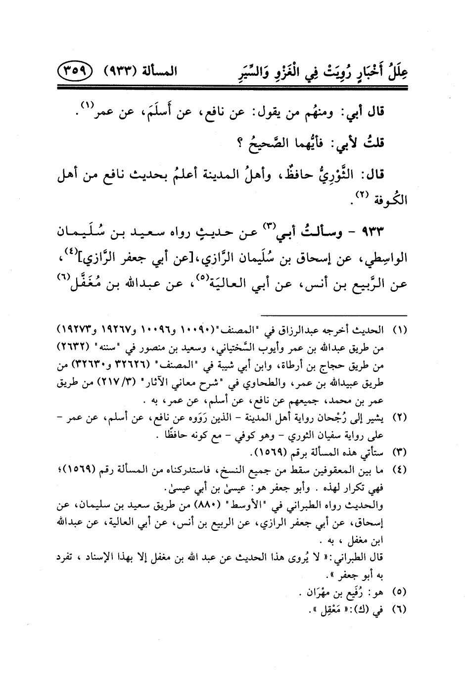 ٩٣٣ - وسألتُ أَبِي (٣) عَنْ حديثٍ رَوَاهُ سَعِيدُ بْنُ سُلَيمان الواسِطي، عَنْ إِسْحَاقَ بْنِ سُلَيمان الرَّازي، [عَنْ أَبِي جَعْفَرٍ الرَّازي] (٤) ، عَنْ الرَّبيع بْنِ أَنَسٍ، عَنْ أَبِي العاليَة (٥) ، عن عبد الله بن مُغَفَّل (٦)