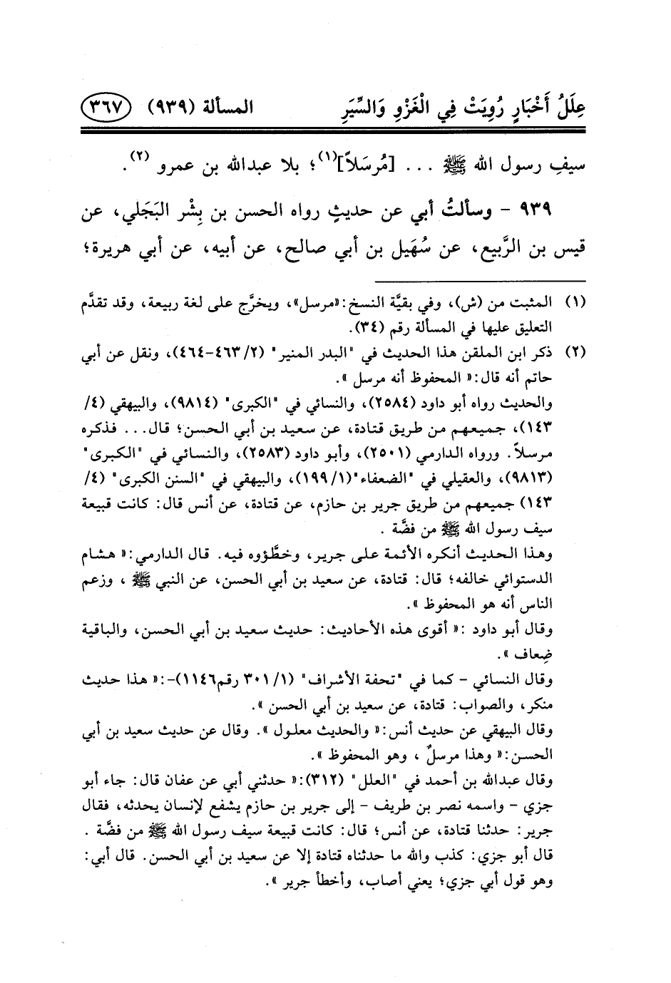 والحديث رواه أبو داود (٢٥٨٤) ، والنسائي في "الكبرى" (٩٨١٤) ، والبيهقي (٤/١٤٣) ، جميعهم من طريق قتادة، عَنْ سَعِيدِ بْنِ أَبِي الحسن؛ قال ... فذكره مرسلاً. ورواه الدارمي (٢٥٠١) ، وأبو داود (٢٥٨٣) ، والنسائي في "الكبرى" (٩٨١٣) ، والعقيلي في "الضعفاء" (١/١٩٩) ، والبيهقي في "السنن الكبرى" (٤/١٤٣) جميعهم من طريق جَرِيرِ بْنِ حَازِمٍ، عَنْ قَتَادَةَ، عن أنس قَالَ: كَانَتْ قَبِيعَةُ سَيْفِ رَسُولِ الله (ص) من فضَّة.