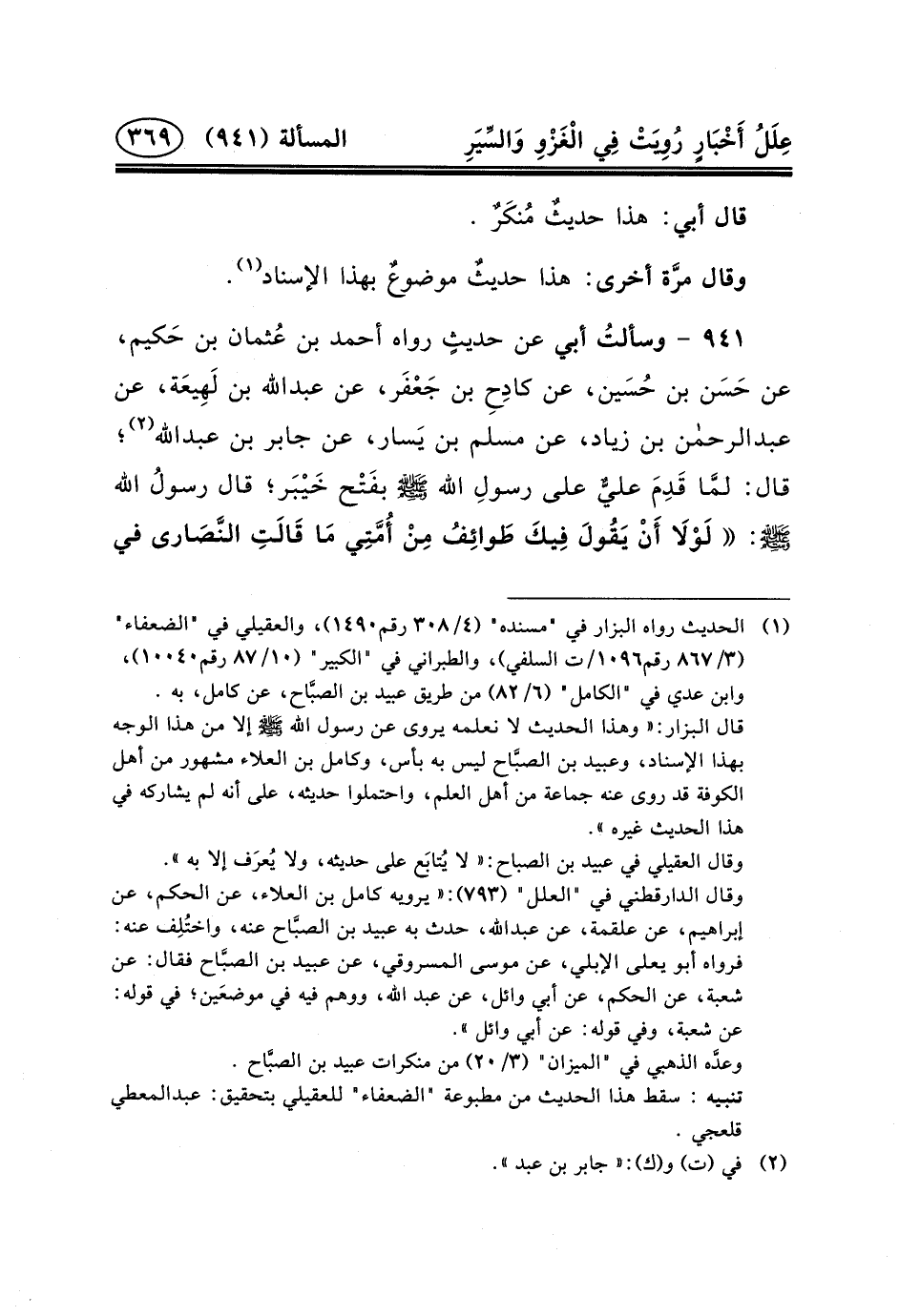 ٩٤١ - وسألتُ أَبِي عن حديثٍ رواه أحمد ابن عُثمان بْنِ حَكيم، عَنْ حَسَن بن حُسَين، عَنْ كادِحِ بْنِ جَعْفَر، عَنْ عبد الله بن لَهِيعَة، عن عبد الرحمن بْنِ زِيَادٍ، عَنْ مُسْلِمِ بْنِ يَسار، عن جابر بن عبد الله (٢) ؛ قَالَ: لمَّا قَدِمَ عليٌّ عَلَى رسولِ الله (ص) بفَتْح خَيْبَر؛ قَالَ رسولُ اللَّهِ (ص) : لَوْلَا أَنْ يَقُولَ فِيكَ طَوائِفُ مِنْ أُمَّتِي مَا قَالَتِ النَّصَارى في