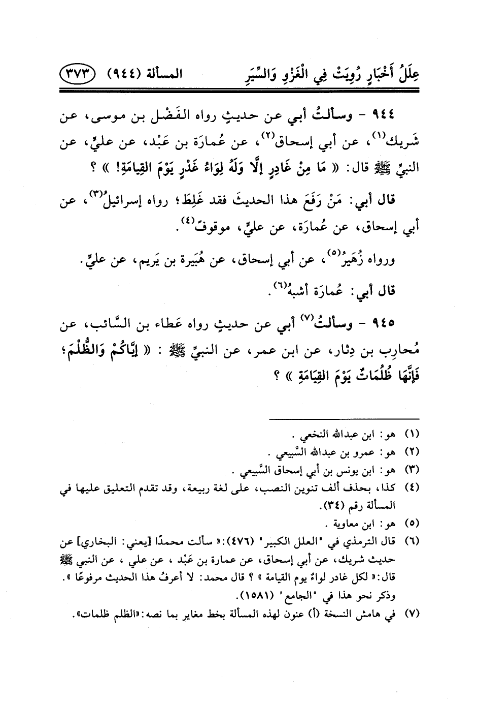 ٩٤٤ - وسألتُ أَبِي عَنْ حديثٍ رَوَاهُ الفَضْل بْنُ مُوسَى، عَنْ شَريك (١) ، عَنْ أَبِي إِسْحَاقَ (٢) ، عَنْ عُمارَة بْنِ عَبْد، عَنْ عليٍّ، عَنِ النبيِّ (ص) قَالَ: مَا مِنْ غَادِرٍ إلَاّ وَلَهُ لِوَاءُ غَدْرٍ يَوْمَ القِيامَةِ! ؟