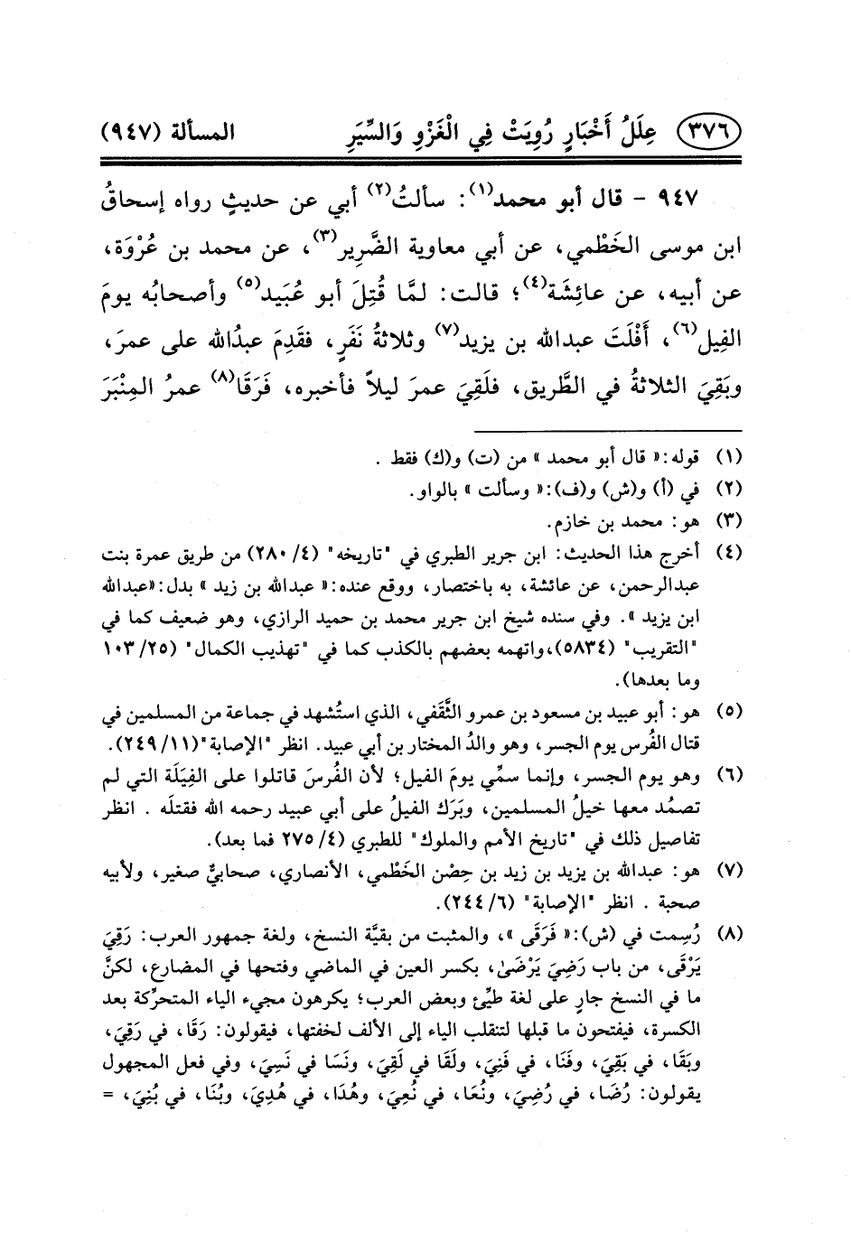 ٩٤٧ - قَالَ أَبُو مُحَمَّدٍ (١) : سألتُ (٢) أَبِي عَنْ حديثٍ رَوَاهُ إسحاقُ بْنُ مُوسَى الخَطْمي، عَنْ أَبِي مُعَاوِيَةَ الضَّرِير (٣) ، عَنْ مُحَمَّدِ بْنِ عُرْوَة، عَنْ أَبِيهِ، عَنْ عائِشَة (٤) ؛ قَالَتْ: لمَّا قُتِلَ أَبُو عُبَيد (٥) وأصحابُه يومَ الفِيل (٦) ، أَفْلَتَ عبد الله بْنُ يَزِيدَ (٧)